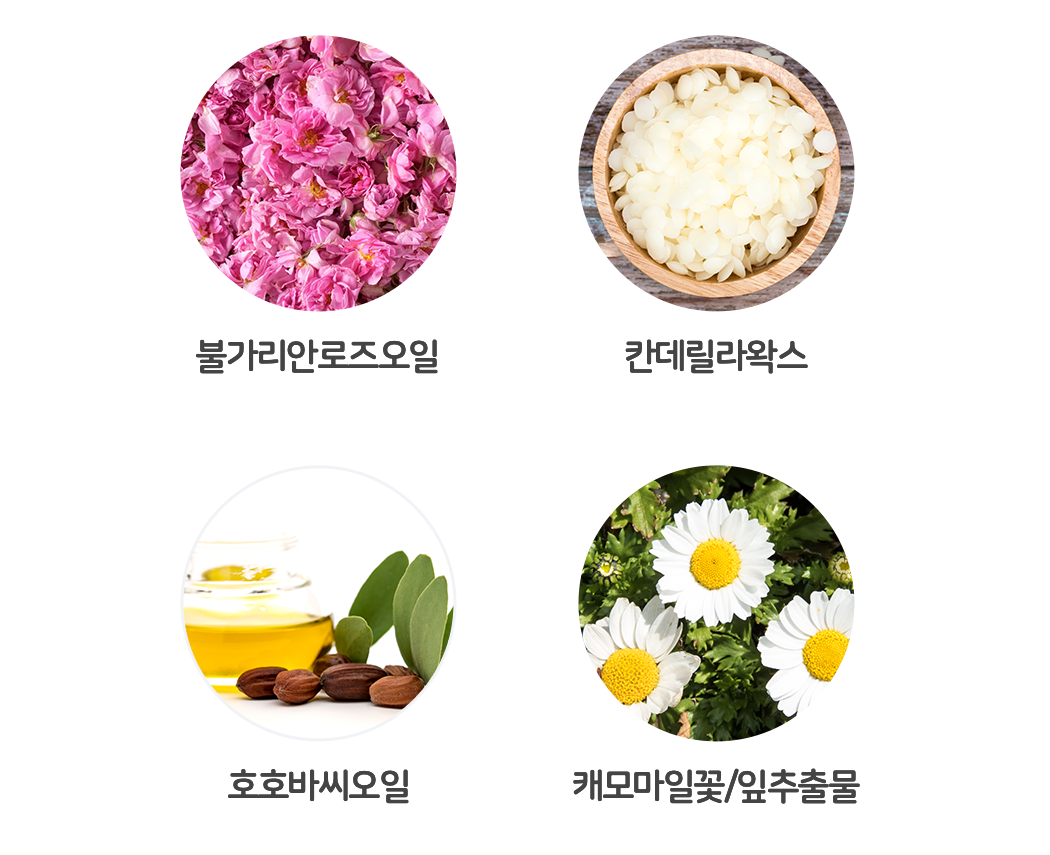 글리세린, 마카다미아씨오일, 올리브오일, 정제수, 카프릴릭/카프릭트리글리세라이드, 아르간커넬오일, 호호바씨오일, 시어버터, 아라키딜알코올, 베헤닐알코올, 아라키딜글루코사이드, 다마스크장미꽃오일(불가리안 공인), 칸데릴라왁스, 솔비탄스테아레이트, 다마스크장미꽃수, 토코페롤, 로즈마리추출물, 니아울리잎오일, 마트리카리아꽃/잎추출물, 병풀추출물, 스페인감초뿌리추출물, 카보머, 알지닌, 부틸렌글라이콜, 1,2-헥산다이올, 포트마리골드꽃추출물, 황금추출물, 모란뿌리추출물, 시트로넬올, 제라니올, 파네솔, 유제놀, 리날룰
