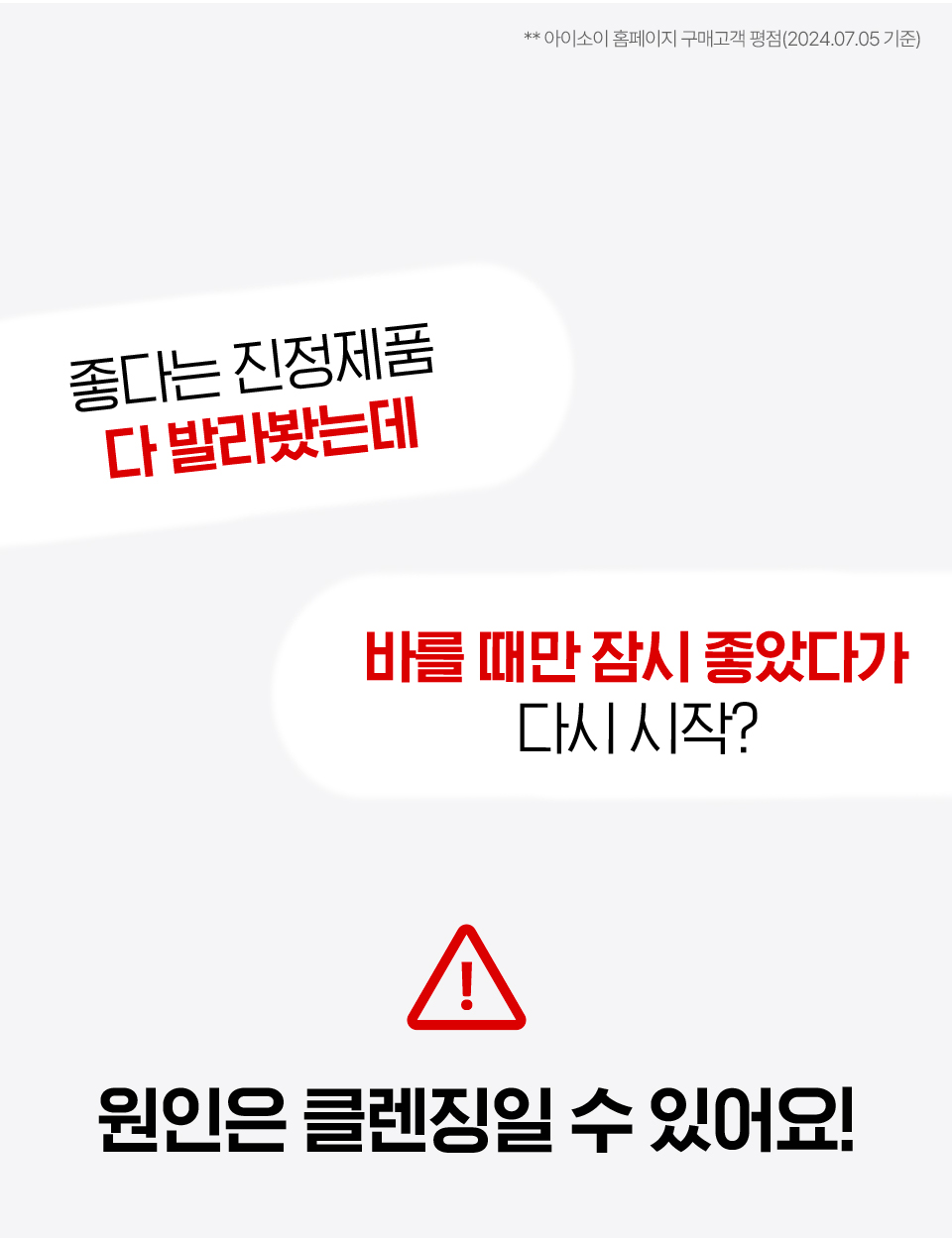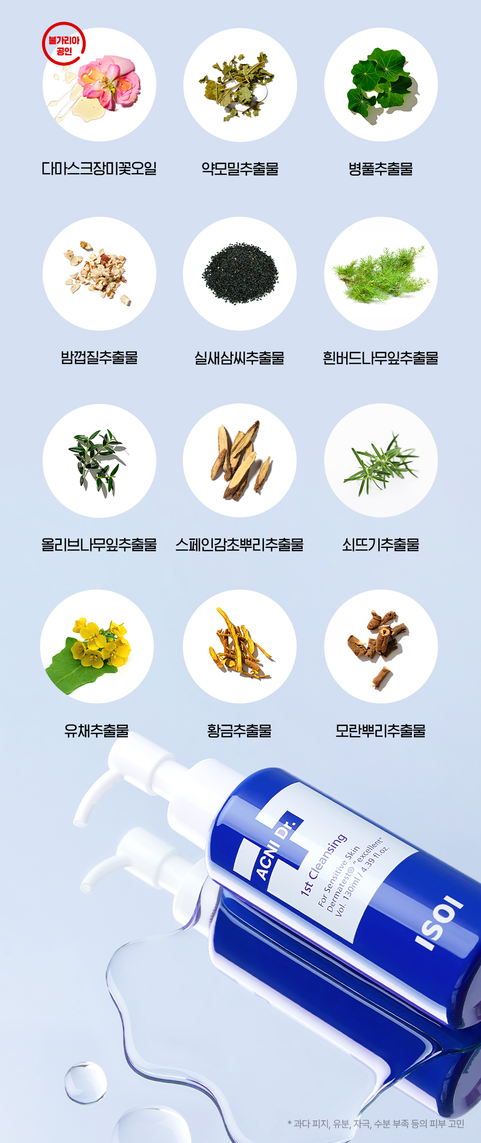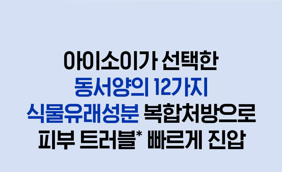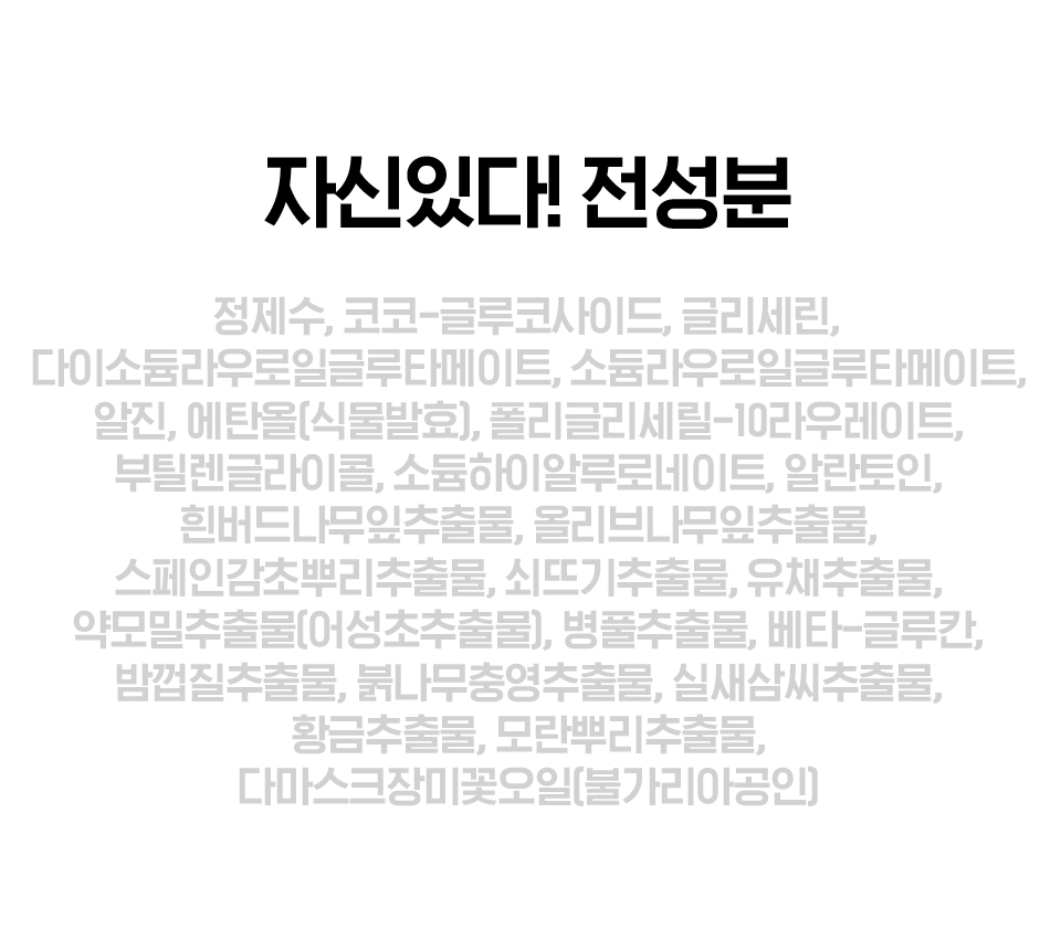 정제수, 코코-글루코사이드, 글리세린, 다이소듐라우로일글루타메이트, 소듐라우로일글루타메이트, 알진, 에탄올, 폴리글리세릴-10라우레이트, 부틸렌글라이콜, 소듐하이알루로네이트, 알란토인, 흰버드나무잎추출물, 올리브나무잎추출물, 스페인감초뿌리추출물, 쇠뜨기추출물, 유채추출물, 약모밀추출물, 병풀추출물, 베타-글루칸, 밤껍질추출물, 붉나무충영추출물, 실새삼씨추출물, 황금추출물, 모란뿌리추출물, 다마스크장미꽃오일 *아이소이에서 사용하는 에탄올은 식물발효성분입니다.