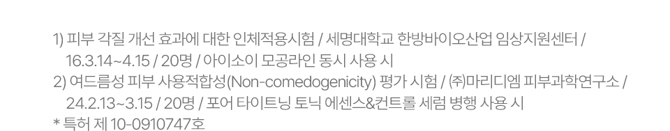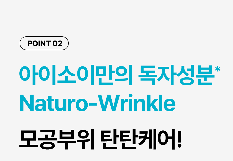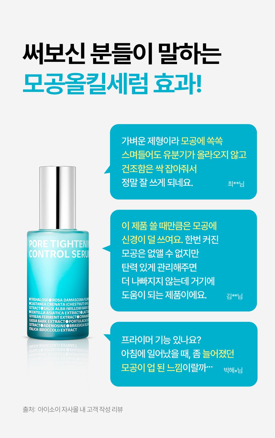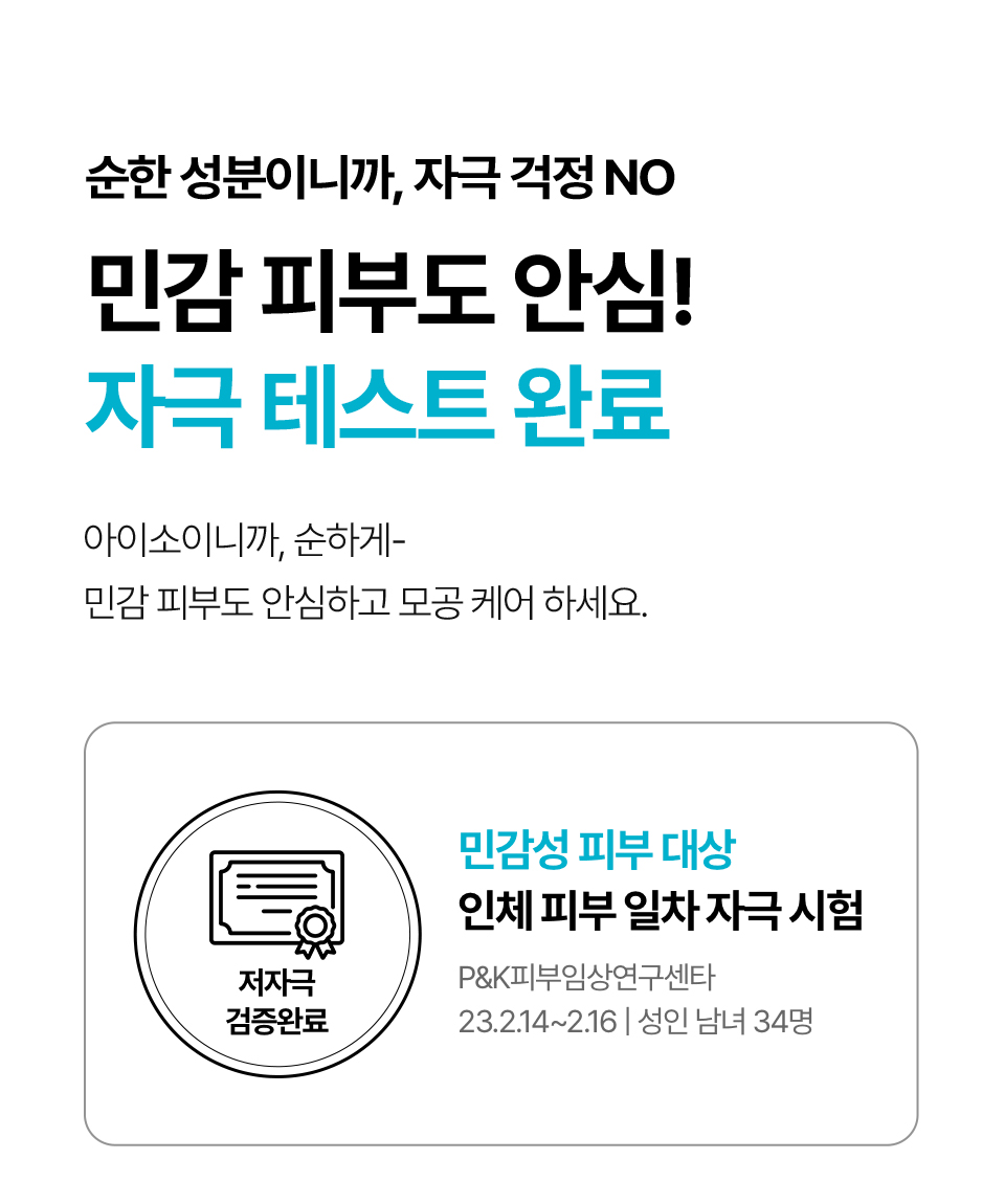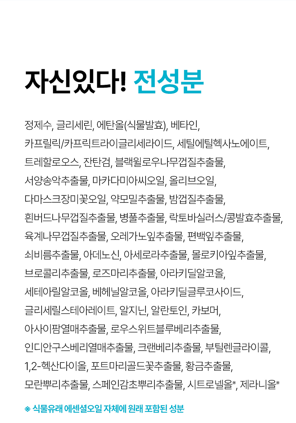 정제수, 글리세린, 에탄올, 베타인, 카프릴릭/카프릭트라이글리세라이드, 세틸에틸헥사노에이트, 트레할로오스, 잔탄검, 블랙윌로우나무껍질추출물 , 서양송악추출물, 마카다미아씨오일, 올리브오일, 다마스크장미꽃오일, 약모밀추출물, 밤껍질추출물, 흰버드나무껍질추출물, 병풀추출물, 락토바실러스/콩발효추출물, 육계나무껍질추출물, 오레가노잎추출물, 편백잎추출물, 쇠비름추출물, 아데노신, 아세로라추출물, 몰로키아잎추출물, 브로콜리추출물, 로즈마리추출물, 아라키딜알코올, 세테아릴알코올, 베헤닐알코올, 아라키딜글루코사이드, 글리세릴스테아레이트, 알지닌, 알란토인, 카보머, 아사이팜열매추출물, 로우스위트블루베리추출물, 인디안구스베리열매추출물, 크랜베리추출물, 부틸렌글라이콜, 1,2-헥산다이올, 포트마리골드꽃추출물, 황금추출물, 모란뿌리추출물, 스페인감초뿌리추출물, 시트로넬올, 제라니올 *아이소이에서 사용하는 에탄올은 식물발효성분입니다.