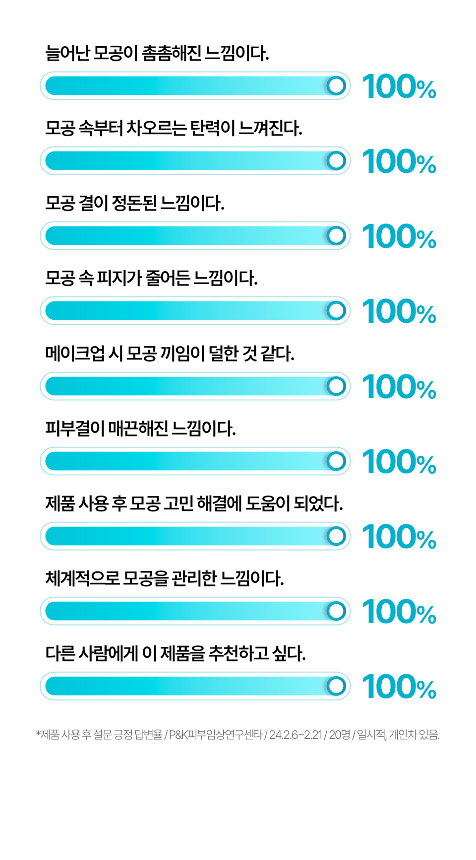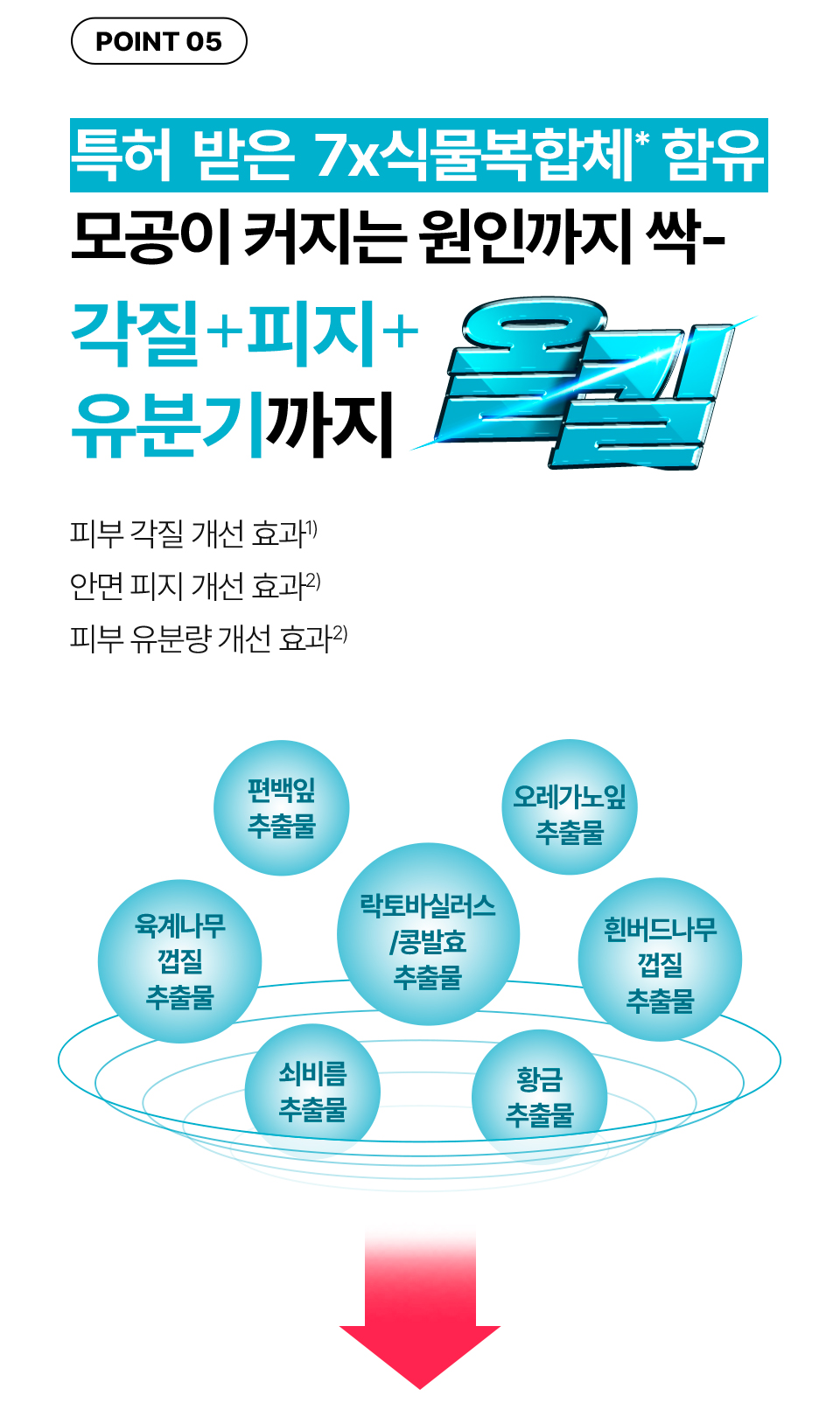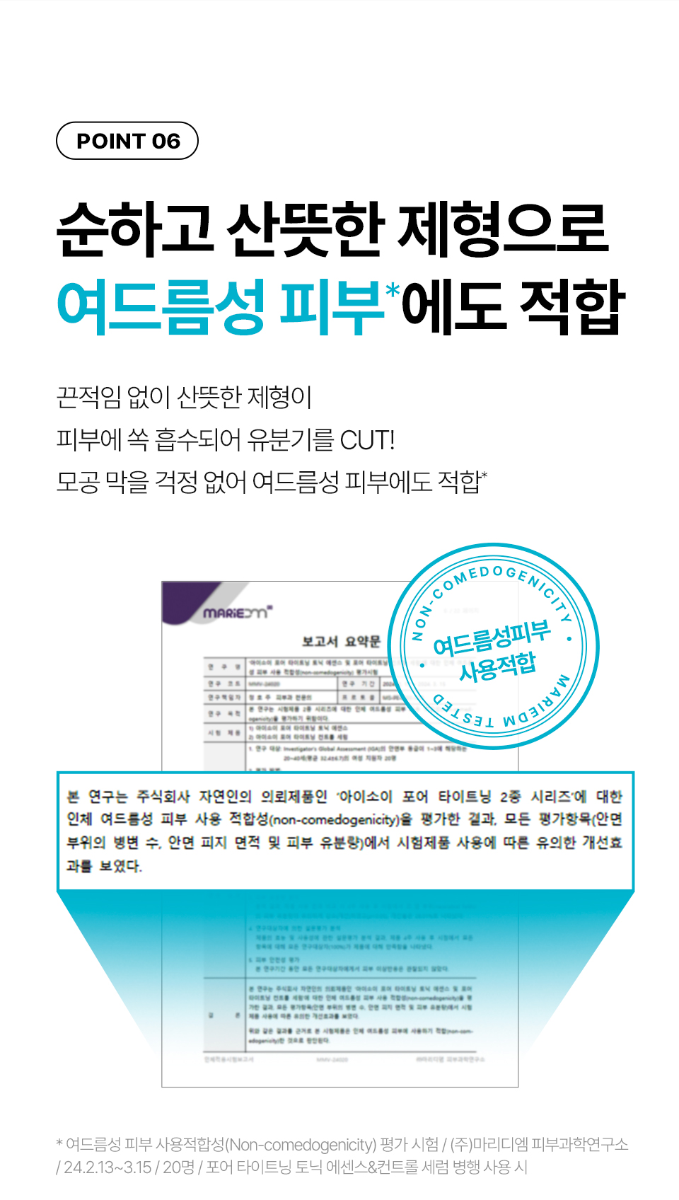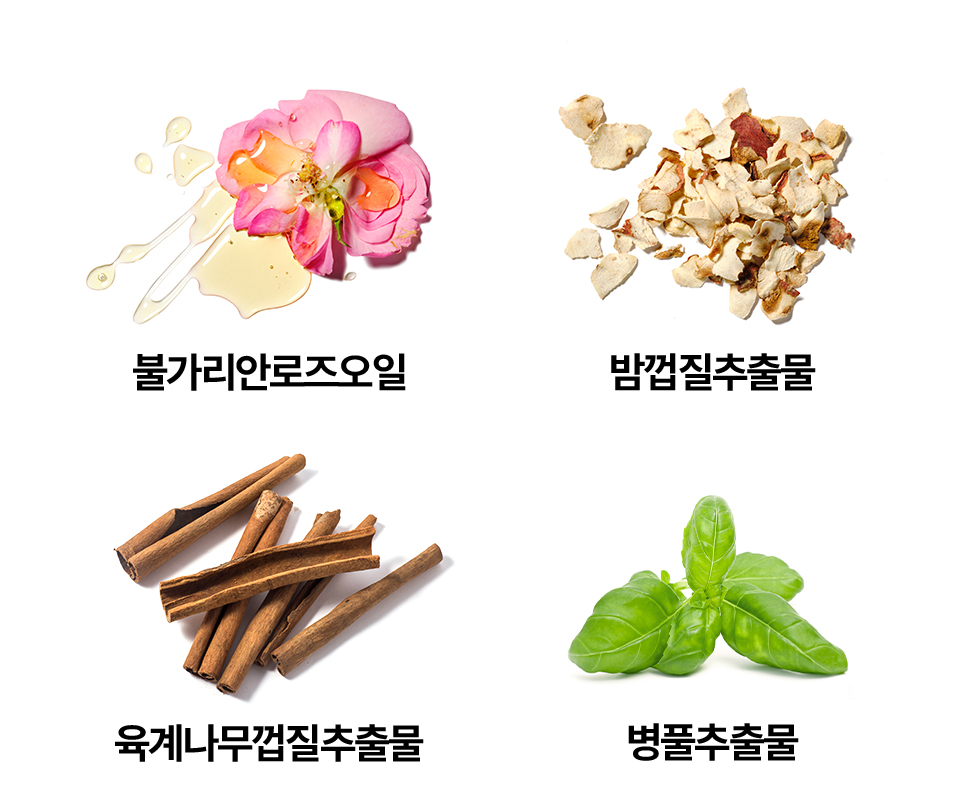 정제수, 글리세린, 에탄올, 베타인, 카프릴릭/카프릭트라이글리세라이드, 세틸에틸헥사노에이트, 트레할로오스, 잔탄검, 블랙윌로우나무껍질추출물 , 서양송악추출물, 마카다미아씨오일, 올리브오일, 다마스크장미꽃오일, 약모밀추출물, 밤껍질추출물, 흰버드나무껍질추출물, 병풀추출물, 락토바실러스/콩발효추출물, 육계나무껍질추출물, 오레가노잎추출물, 편백잎추출물, 쇠비름추출물, 아데노신, 아세로라추출물, 몰로키아잎추출물, 브로콜리추출물, 로즈마리추출물, 아라키딜알코올, 세테아릴알코올, 베헤닐알코올, 아라키딜글루코사이드, 글리세릴스테아레이트, 알지닌, 알란토인, 카보머, 아사이팜열매추출물, 로우스위트블루베리추출물, 인디안구스베리열매추출물, 크랜베리추출물, 부틸렌글라이콜, 1,2-헥산다이올, 포트마리골드꽃추출물, 황금추출물, 모란뿌리추출물, 스페인감초뿌리추출물, 시트로넬올, 제라니올 *아이소이에서 사용하는 에탄올은 식물발효성분입니다.