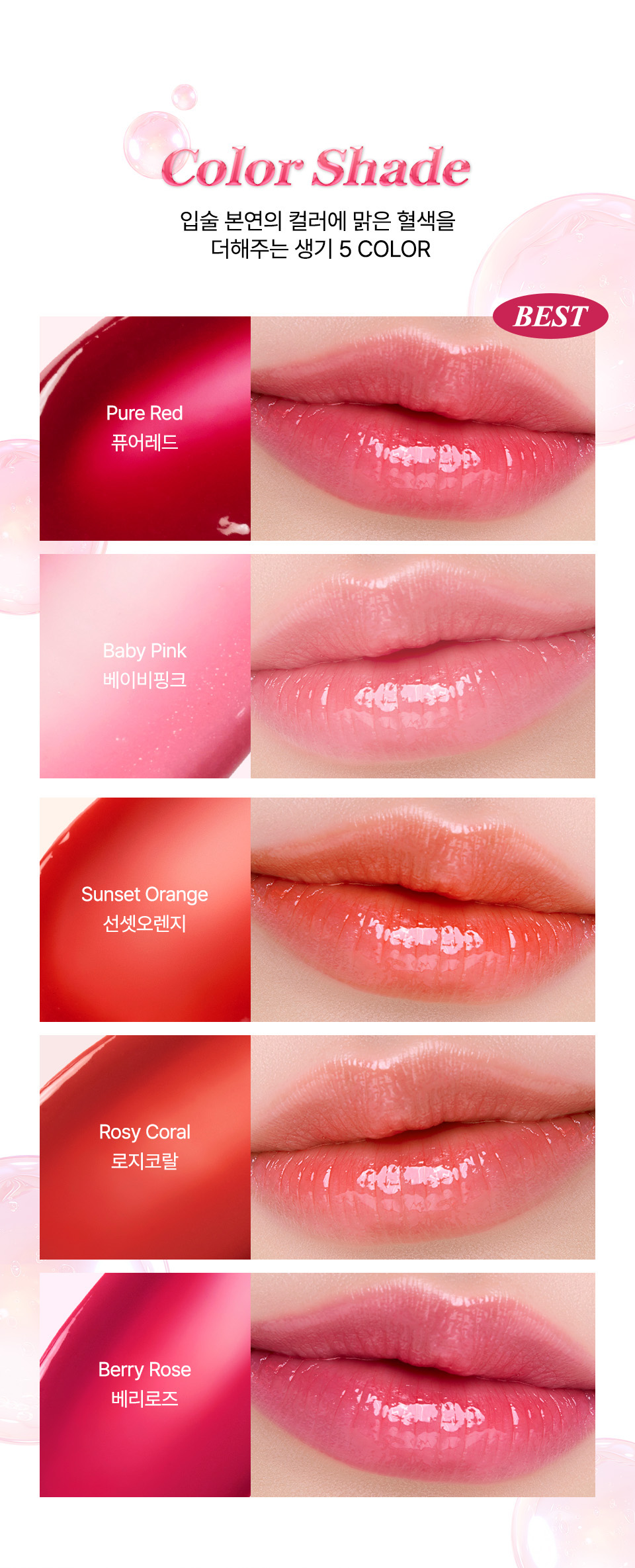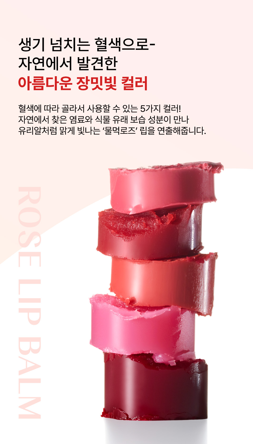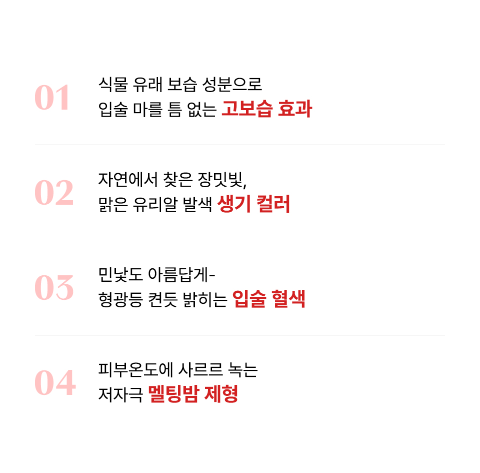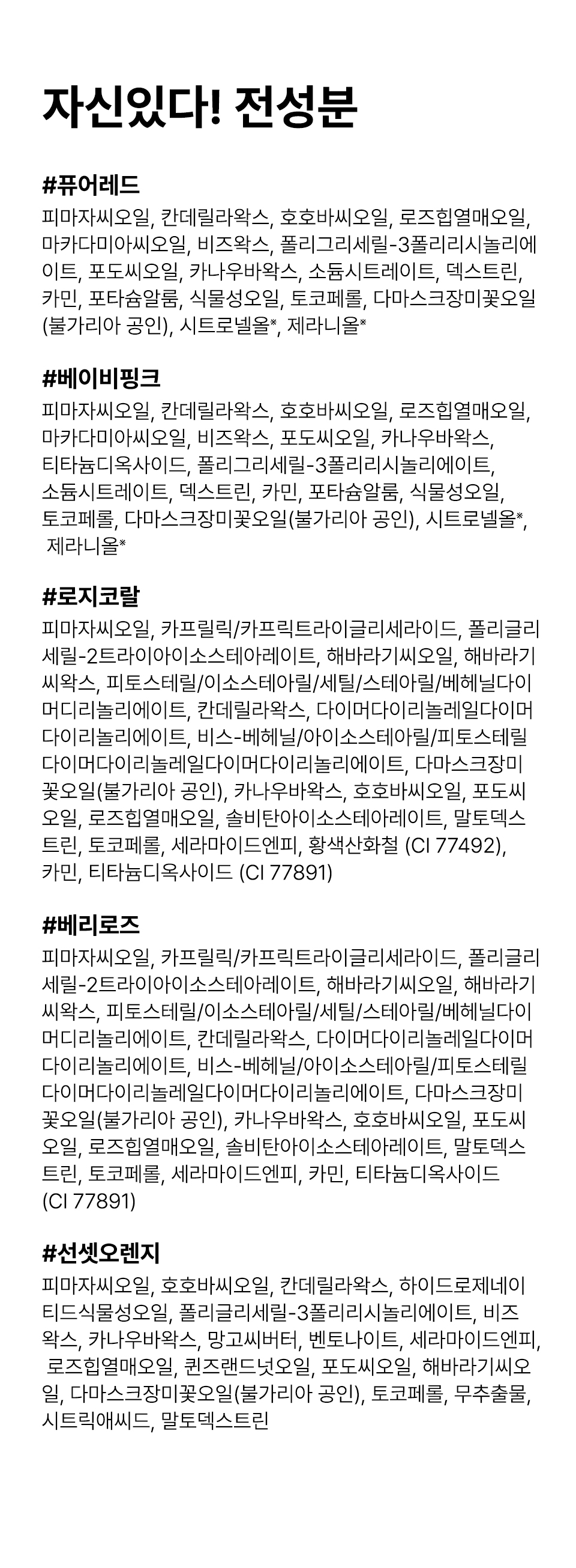 [퓨어 레드] 피마자씨오일, 칸데릴라왁스, 호호바씨오일, 로즈힙열매오일, 마카다미아씨오일, 비즈왁스, 폴리글리세릴-3폴리리시놀리에이트, 포도씨오일, 카나우바왁스, 소듐시트레이트, 덱스트린, 카민, 포타슘알룸, 식물성오일, 토코페롤, 다마스크장미꽃오일,시트로넬올, 제라니올 * 카민추출물을 함유하고 있으므로 이 성분에 과민하거나 알레르기가 있는 사람은 신중히 사용할 것.<br> [베이비 핑크] 피마자씨오일, 칸데릴라왁스, 호호바씨오일, 로즈힙열매오일, 마카다미아씨오일, 비즈왁스, 포도씨오일, 카나우바왁스, 티타늄디옥사이드(나노화하지 않음), 폴리글리세릴-3폴리리시놀리에이트, 소듐시트레이트, 덱스트린, 카민, 포타슘알룸, 식물성오일, 토코페롤, 다마스크장미꽃오일, 시트로넬올, 제라니올 * 카민추출물을 함유하고 있으므로 이 성분에 과민하거나 알레르기가 있는 사람은 신중히 사용할 것.<br> [선셋오렌지] 피마자씨오일, 호호바씨오일, 칸데릴라왁스, 하이드로제네이티드식물성오일, 폴리글리세릴-3폴리리시놀리에이트, 비즈왁스, 카나우바왁스, 망고씨버터,벤토나이트, 세라마이드엔피, 로즈힙열매오일, 퀸즈랜드넛오일, 포도씨오일, 해바라기씨오일, 다마스크장미꽃오일(불가리아공인), 토코페롤, 무추출물,시트릭애씨드, 말토덱스트린<br> [로지코랄] 피마자씨오일, 카프릴릭/카프릭트라이글리세라이드, 폴리글리세릴-2트라이아이소스테아레이트, 해바라기씨오일, 해바라기씨왁스,피토스테릴/이소스테아릴/세틸/스테아릴/베헤닐다이머디리놀리에이트, 칸데릴라왁스, 다이머다이리놀레일다이머다이리놀리에이트,비스-베헤닐/아이소스테아릴/피토스테릴다이머다이리놀레일다이머다이리놀리에이트, 다마스크장미꽃오일(불가리아공인), 카나우바왁스, 호호바씨오일,포도씨오일, 로즈힙열매오일, 솔비탄아이소스테아레이트, 말토덱스트린, 토코페롤, 세라마이드엔피, 황색산화철 (CI 77492), 카민, 티타늄디옥사이드 (CI77891) * 카민추출물을 함유하고 있으므로 이 성분에 과민하거나 알레르기가 있는 사람은 신중히 사용할 것.<br> [베리로즈] 피마자씨오일, 카프릴릭/카프릭트라이글리세라이드, 폴리글리세릴-2트라이아이소스테아레이트, 해바라기씨오일, 해바라기씨왁스,피토스테릴/이소스테아릴/세틸/스테아릴/베헤닐다이머디리놀리에이트, 칸데릴라왁스, 다이머다이리놀레일다이머다이리놀리에이트,비스-베헤닐/아이소스테아릴/피토스테릴다이머다이리놀레일다이머다이리놀리에이트, 다마스크장미꽃오일(불가리아 공인), 카나우바왁스,호호바씨오일, 포도씨오일, 로즈힙열매오일, 솔비탄아이소스테아레이트, 말토덱스트린, 토코페롤, 세라마이드엔피, 카민, 티타늄디옥사이드 (CI 77891) * 카민추출물을 함유하고 있으므로 이 성분에 과민하거나 알레르기가 있는 사람은 신중히 사용할 것.