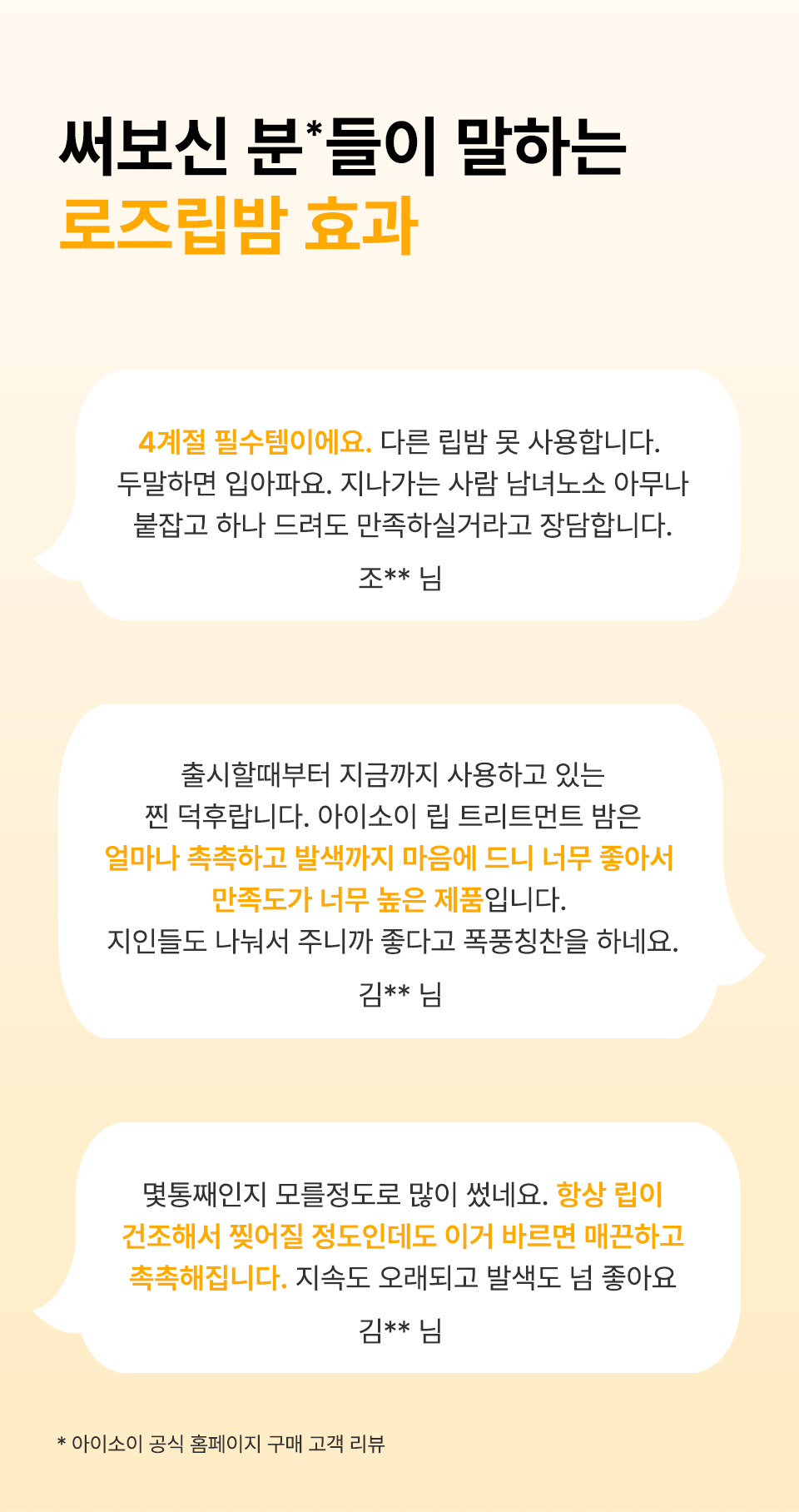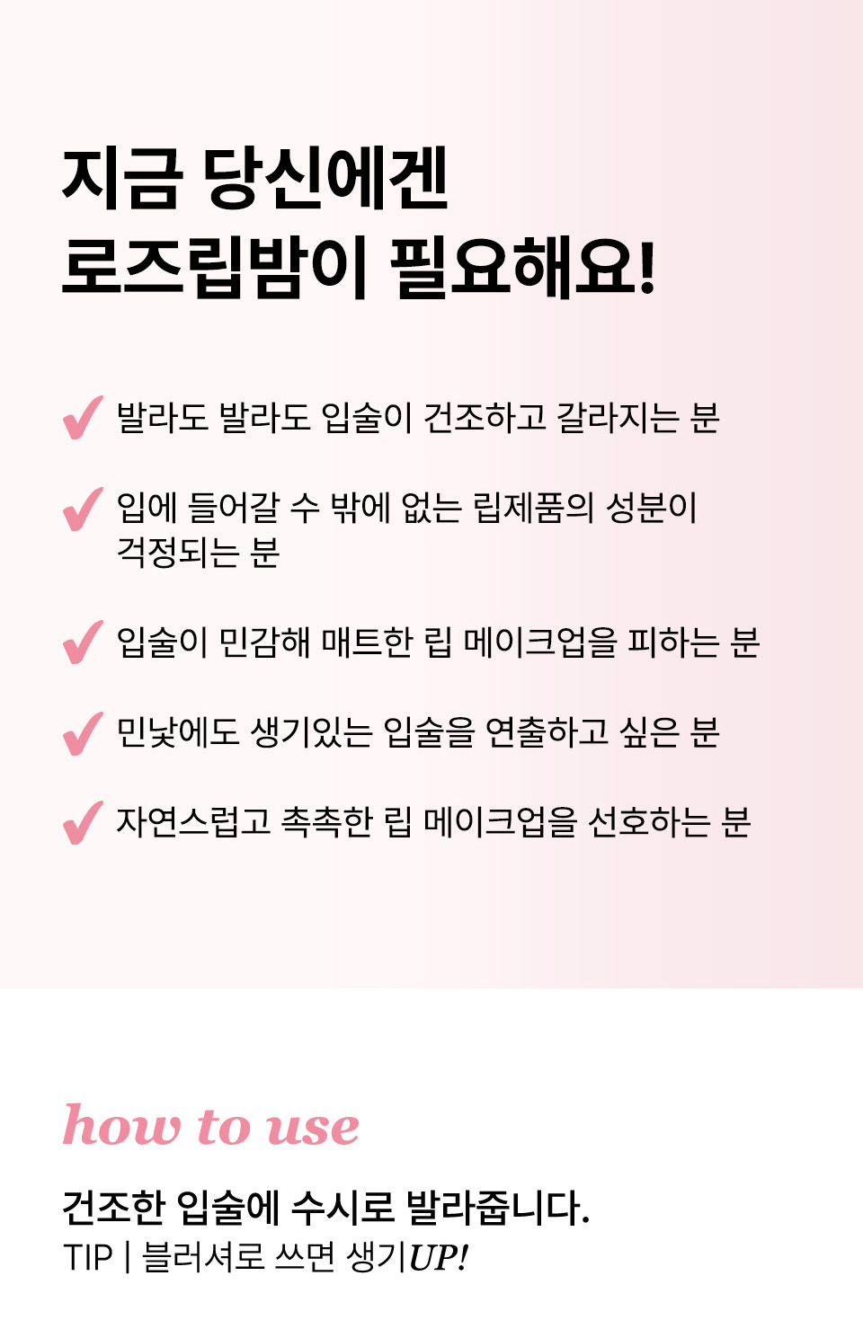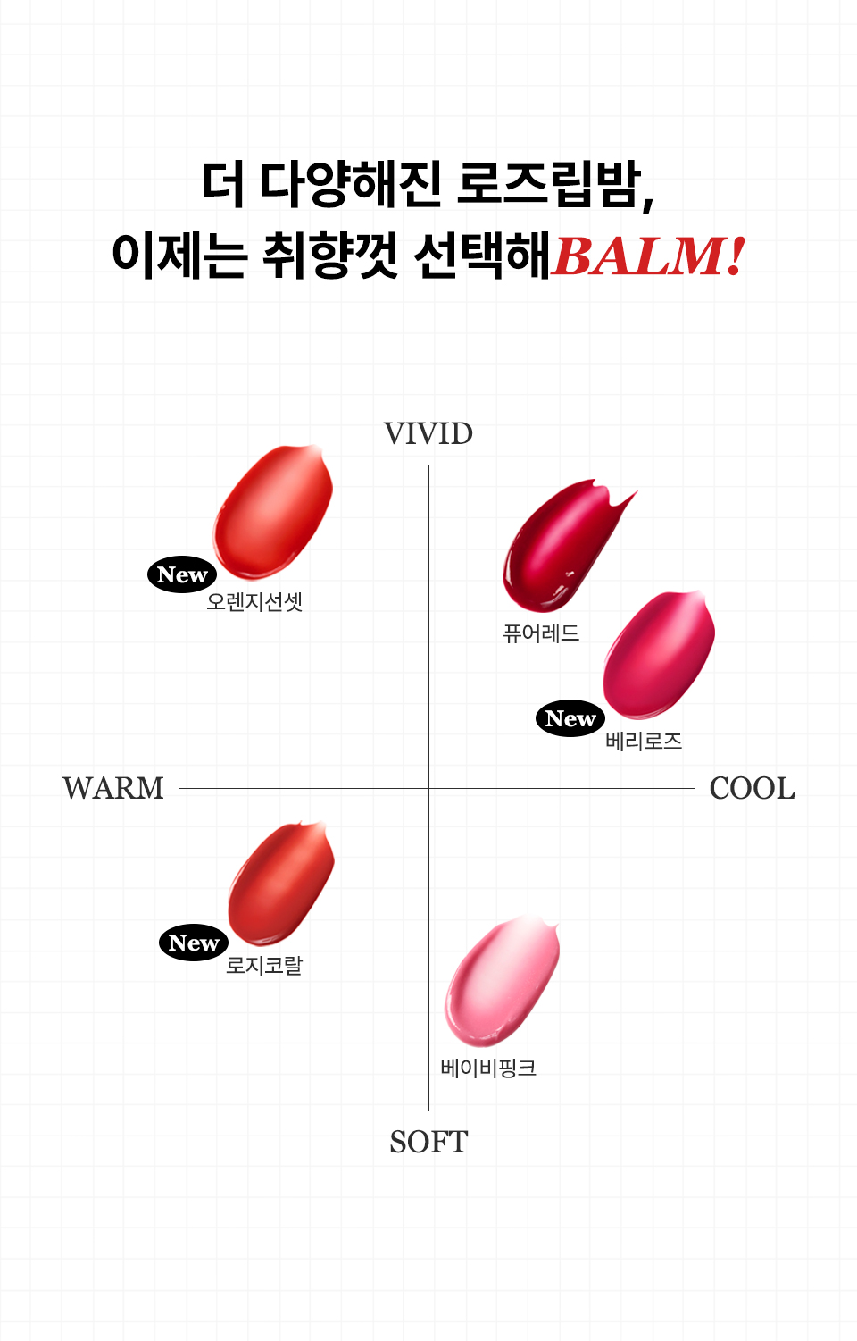 [퓨어 레드] 피마자씨오일, 칸데릴라왁스, 호호바씨오일, 로즈힙열매오일, 마카다미아씨오일, 비즈왁스, 폴리글리세릴-3폴리리시놀리에이트, 포도씨오일, 카나우바왁스, 소듐시트레이트, 덱스트린, 카민, 포타슘알룸, 식물성오일, 토코페롤, 다마스크장미꽃오일,시트로넬올, 제라니올 * 카민추출물을 함유하고 있으므로 이 성분에 과민하거나 알레르기가 있는 사람은 신중히 사용할 것.<br> [베이비 핑크] 피마자씨오일, 칸데릴라왁스, 호호바씨오일, 로즈힙열매오일, 마카다미아씨오일, 비즈왁스, 포도씨오일, 카나우바왁스, 티타늄디옥사이드(나노화하지 않음), 폴리글리세릴-3폴리리시놀리에이트, 소듐시트레이트, 덱스트린, 카민, 포타슘알룸, 식물성오일, 토코페롤, 다마스크장미꽃오일, 시트로넬올, 제라니올 * 카민추출물을 함유하고 있으므로 이 성분에 과민하거나 알레르기가 있는 사람은 신중히 사용할 것.<br> [선셋오렌지] 피마자씨오일, 호호바씨오일, 칸데릴라왁스, 하이드로제네이티드식물성오일, 폴리글리세릴-3폴리리시놀리에이트, 비즈왁스, 카나우바왁스, 망고씨버터,벤토나이트, 세라마이드엔피, 로즈힙열매오일, 퀸즈랜드넛오일, 포도씨오일, 해바라기씨오일, 다마스크장미꽃오일(불가리아공인), 토코페롤, 무추출물,시트릭애씨드, 말토덱스트린<br> [로지코랄] 피마자씨오일, 카프릴릭/카프릭트라이글리세라이드, 폴리글리세릴-2트라이아이소스테아레이트, 해바라기씨오일, 해바라기씨왁스,피토스테릴/이소스테아릴/세틸/스테아릴/베헤닐다이머디리놀리에이트, 칸데릴라왁스, 다이머다이리놀레일다이머다이리놀리에이트,비스-베헤닐/아이소스테아릴/피토스테릴다이머다이리놀레일다이머다이리놀리에이트, 다마스크장미꽃오일(불가리아공인), 카나우바왁스, 호호바씨오일,포도씨오일, 로즈힙열매오일, 솔비탄아이소스테아레이트, 말토덱스트린, 토코페롤, 세라마이드엔피, 황색산화철 (CI 77492), 카민, 티타늄디옥사이드 (CI77891) * 카민추출물을 함유하고 있으므로 이 성분에 과민하거나 알레르기가 있는 사람은 신중히 사용할 것.<br> [베리로즈] 피마자씨오일, 카프릴릭/카프릭트라이글리세라이드, 폴리글리세릴-2트라이아이소스테아레이트, 해바라기씨오일, 해바라기씨왁스,피토스테릴/이소스테아릴/세틸/스테아릴/베헤닐다이머디리놀리에이트, 칸데릴라왁스, 다이머다이리놀레일다이머다이리놀리에이트,비스-베헤닐/아이소스테아릴/피토스테릴다이머다이리놀레일다이머다이리놀리에이트, 다마스크장미꽃오일(불가리아 공인), 카나우바왁스,호호바씨오일, 포도씨오일, 로즈힙열매오일, 솔비탄아이소스테아레이트, 말토덱스트린, 토코페롤, 세라마이드엔피, 카민, 티타늄디옥사이드 (CI 77891) * 카민추출물을 함유하고 있으므로 이 성분에 과민하거나 알레르기가 있는 사람은 신중히 사용할 것.