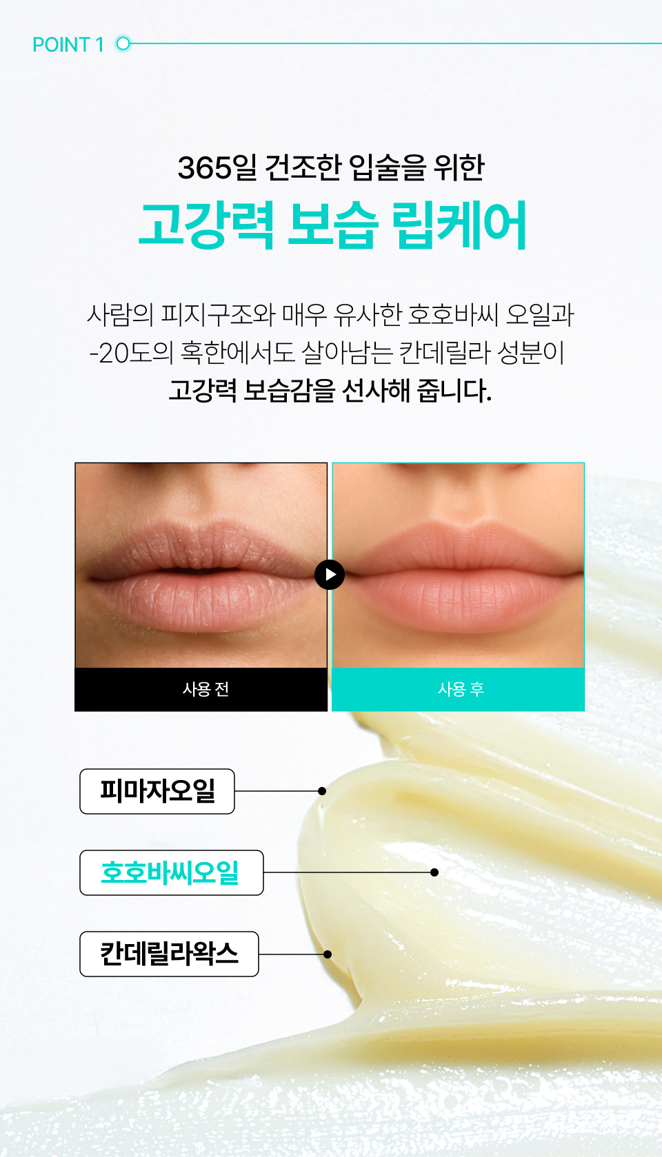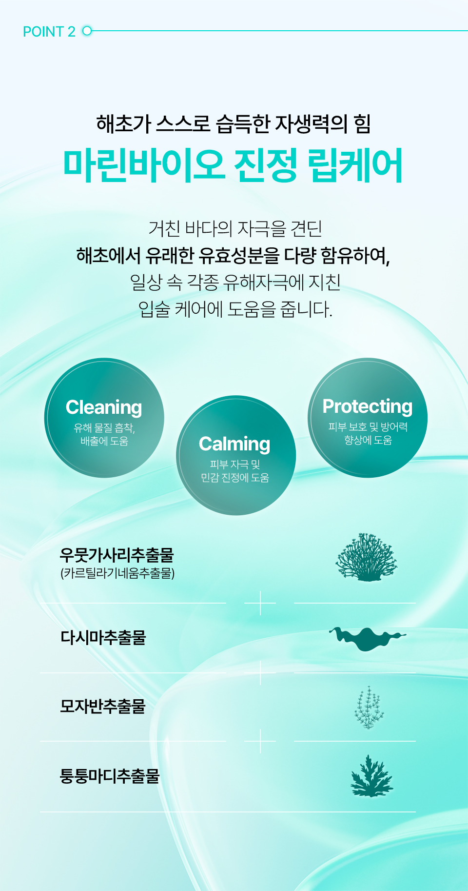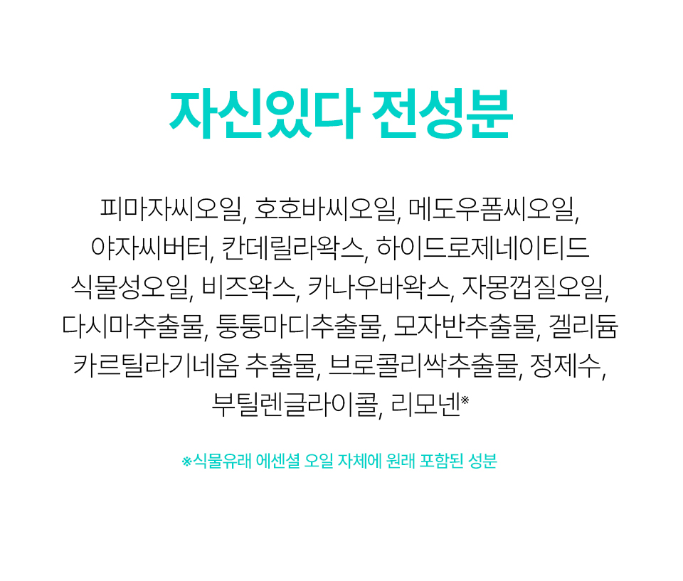 피마자씨오일, 호호바씨오일, 메도우폼씨오일, 야자씨버터, 칸데릴라왁스, 하이드로제네이티드식물성오일, 비즈왁스, 카나우바왁스, 자몽껍질오일, 다시마추출물, 퉁퉁마디추출물, 모자반추출물, 겔리듐 카르틸라기네움추출물, 브로콜리싹추출물, 정제수, 부틸렌글라이콜, 리모넨※ ※식물유래 에센셜오일 자체에 원래 포함된 성분