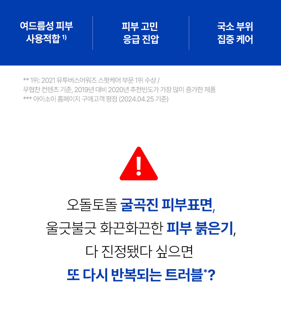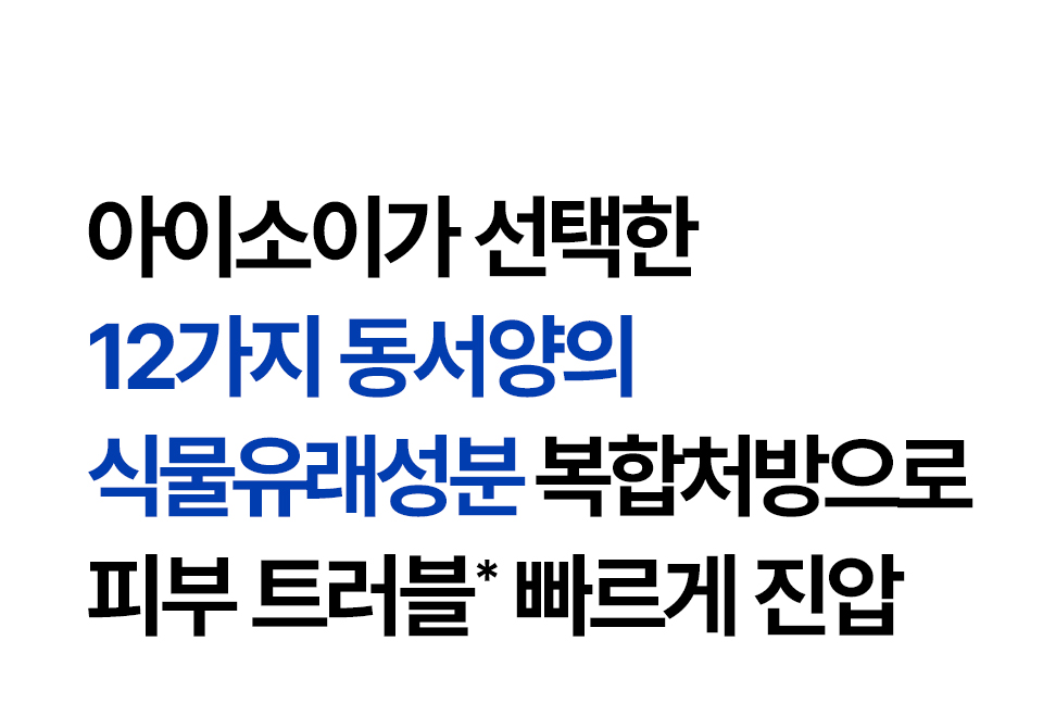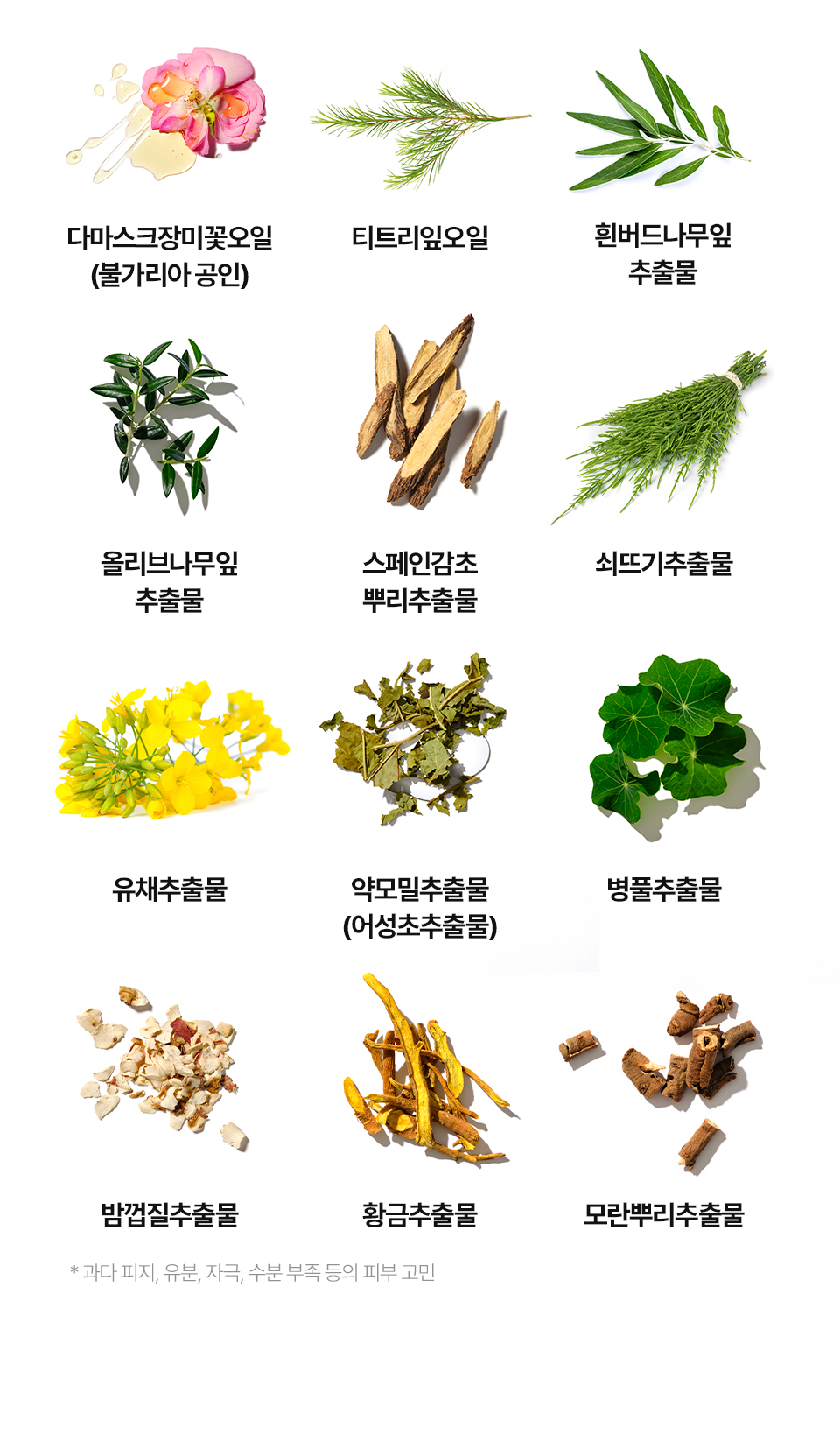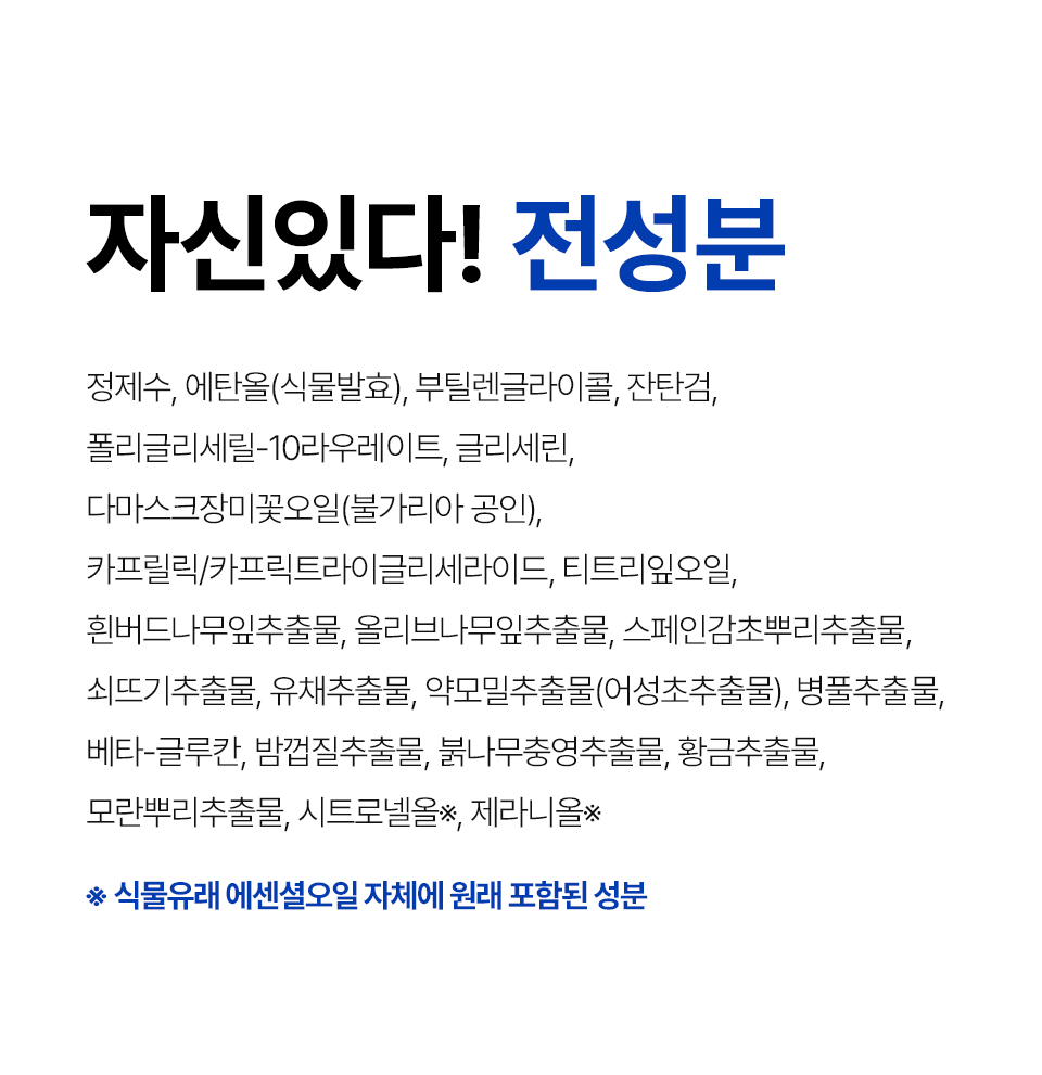 정제수, 에탄올, 부틸렌글라이콜, 잔탄검, 폴리글리세릴-10라우레이트, 글리세린, 다마스크장미꽃오일(불가리아 공인), 카프릴릭/카프릭트라이글리세라이드, 티트리잎오일, 흰버드나무잎추출물, 올리브나무잎추출물, 스페인감초뿌리추출물, 쇠뜨기추출물, 유채추출물, 약모밀추출물(어성초추출물), 병풀추출물, 베타-글루칸, 밤껍질추출물, 붉나무충영추출물, 황금추출물, 모란뿌리추출물, 시트로넬올, 제라니올 *아이소이에서 사용하는 에탄올은 식물발효성분입니다.