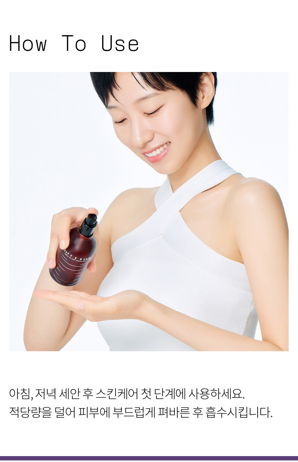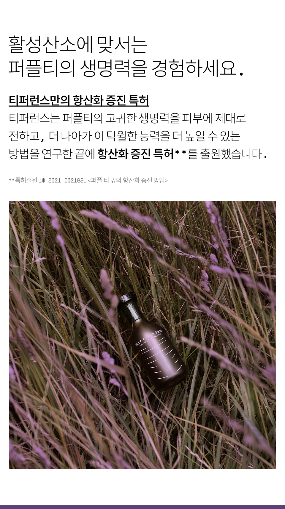 녹차수(퍼플티수80.04%), 글리세린, 부틸렌글라이콜, 정제수, 1,2-헥산다이올, 알부틴, 판테놀, 녹차추출물(퍼플티추출물), 귤껍질추출물, 꾸지뽕나무열매추출물, 팔미토일트라이펩타이드-5, 아데노신, 셀룰로오스검, 인도멀구슬나무꽃추출물, 아이비고드열매추출물, 로즈마리잎오일, 베르가모트오일, 오렌지껍질오일, 포트마리골드꽃추출물, 황금추출물, 모란뿌리추출물, 스페인감초뿌리추출물, 리모넨* (*식물유래 에센셜오일 자체에 원래 포함된 성분)