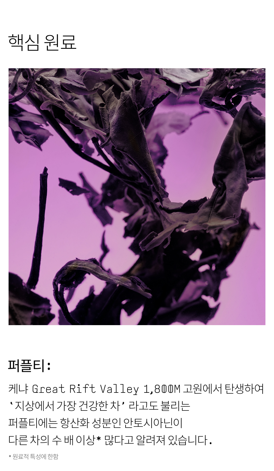 정제수, 글리세린, 녹차수(퍼플티수7.084%), 세틸에틸헥사노에이트, 마카다미아씨오일, 베타인, 펜타에리스리틸테트라아이소스테아레이트, 스쿠알란, 카프릴릭/카프릭트라이글리세라이드, 알부틴, 트레할로오스, 스테아릭애씨드, 아라키딜알코올, 시어버터, 글리세릴스테아레이트, 세테아릴알코올, 올리브오일, 녹차추출물(퍼플티추출물), 귤껍질추출물, 꾸지뽕나무열매추출물, 판테놀, 잔탄검, 베헤닐알코올, 아라키딜글루코사이드, 팔미토일트라이펩타이드-5, 알지닌, 카보머, 아데노신, 인도멀구슬나무꽃추출물, 아이비고드열매추출물, 로즈마리잎오일, 오렌지껍질오일, 베르가모트오일, 부틸렌글라이콜, 1,2-헥산다이올, 포트마리골드꽃추출물, 황금추출물, 모란뿌리추출물, 스페인감초뿌리추출물, 리모넨*, 리날룰* (*식물유래 에센셜오일 자체에 원래 포함된 성분)
