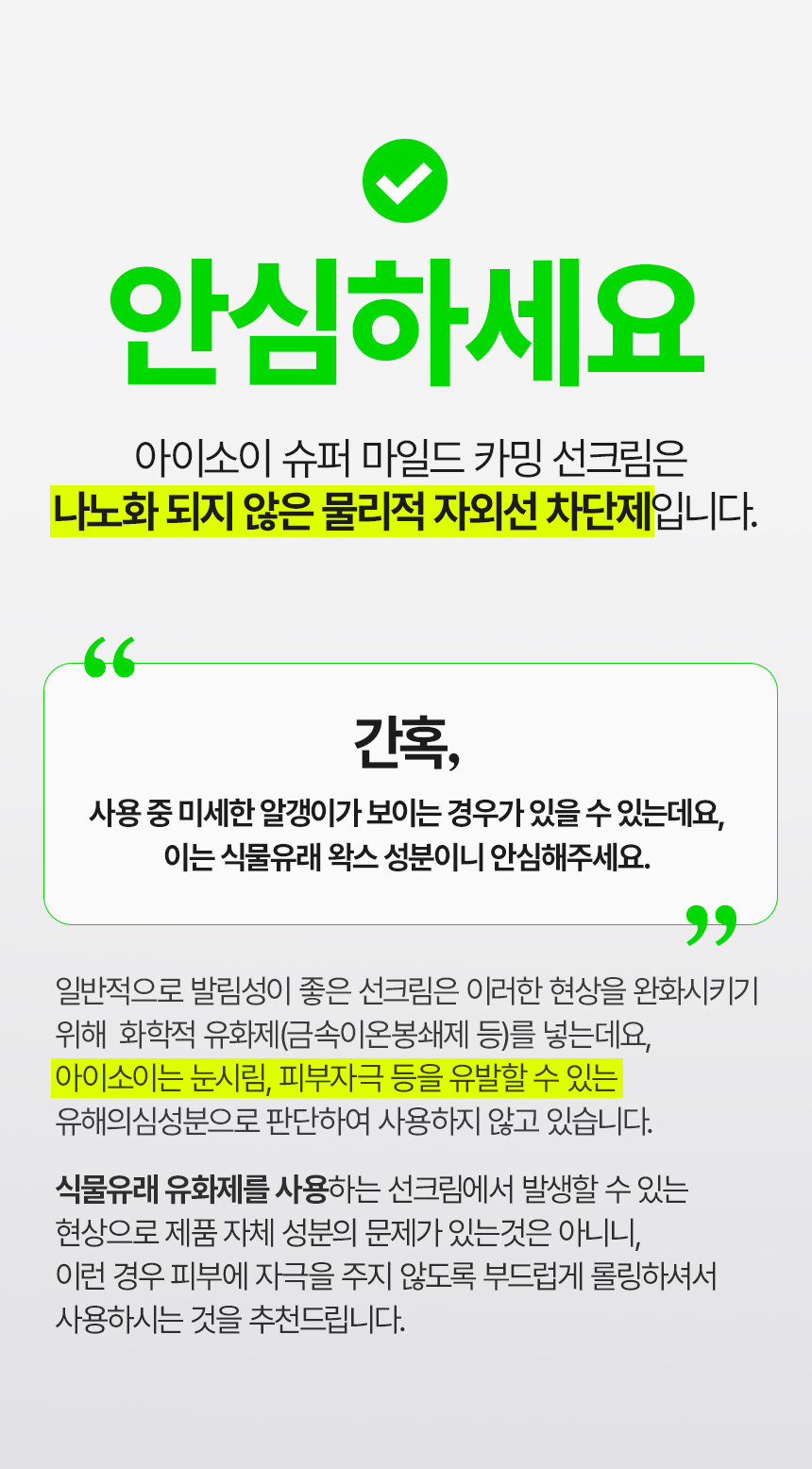 정제수, 징크옥사이드, 코코-카프릴레이트/카프레이트, 티타늄디옥사이드, C12-15알킬벤조에이트, 프로판다이올, 운데케인, 하이드로제네이티드코코넛오일, 폴리글리세릴-3폴리리시놀리에이트, 펜틸렌글라이콜, 실리카, 카프릴릭/카프릭트라이글리세라이드, 트라이데케인, 알루미늄스테아레이트, 알루미나, 글리세린, 동백나무씨오일, 하이드로제네이티드올리브오일불검화물, 라벤더오일, 백미꽃추출물, 접시꽃추출물, 씨사이드에링고캘러스배양여과물, 다마스크장미꽃수, 약모밀추출물, 구주호랑가시나무잎추출물, 서양톱풀오일, 소듐하이알루로네이트, 알로에베라잎추출물, 보리지추출물, 수레국화꽃추출물, 마트리카리아꽃/잎추출물, 히아신스전초추출물, 라벤더꽃수, 클레리추출물, 하이드롤라이즈드하이알루로닉애씨드, 하이알루로닉애씨드, 병풀추출물, 폴리글리세릴-2다이폴리하이드록시스테아레이트, 폴리글리세릴-4올리에이트, 폴리하이드록시스테아릭애씨드, 마그네슘설페이트, 스테아릭애씨드, 스테아랄코늄헥토라이트, 칸데릴라왁스, 글리세릴카프릴레이트, 부틸렌글라이콜, 1,2-헥산다이올, 토코페롤, 에틸헥실글리세린, 벤질글라이콜, 하이드롤라이즈드글라이코사미노글리칸, 하이드록시프로필트라이모늄하이알루로네이트, 소듐하이알루로네이트크로스폴리머, 판테놀, 소듐아세틸레이티드하이알루로네이트, 하이드롤라이즈드소듐하이알루로네이트, 포타슘하이알루로네이트, 마데카소사이드, 아시아틱애씨드, 아시아티코사이드, 마데카식애씨드, 리날룰※ (※식물유래 에센셜오일 자체에 원래 포함된 성분)