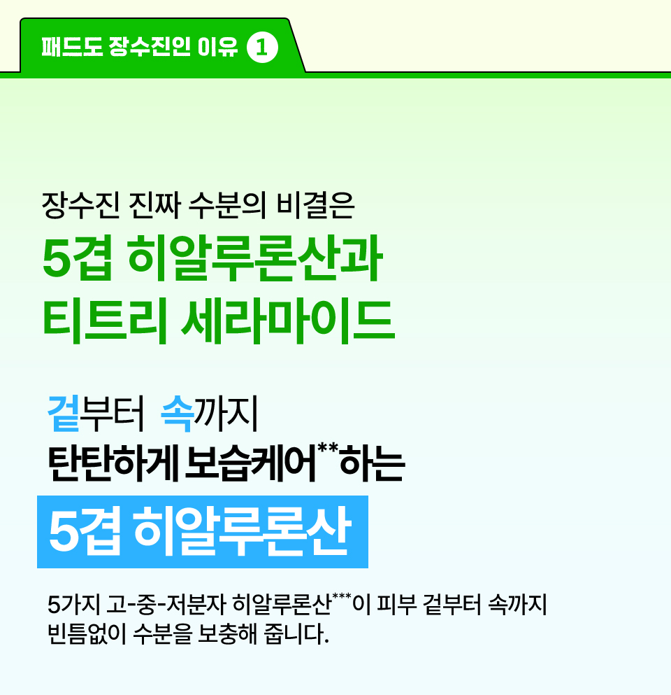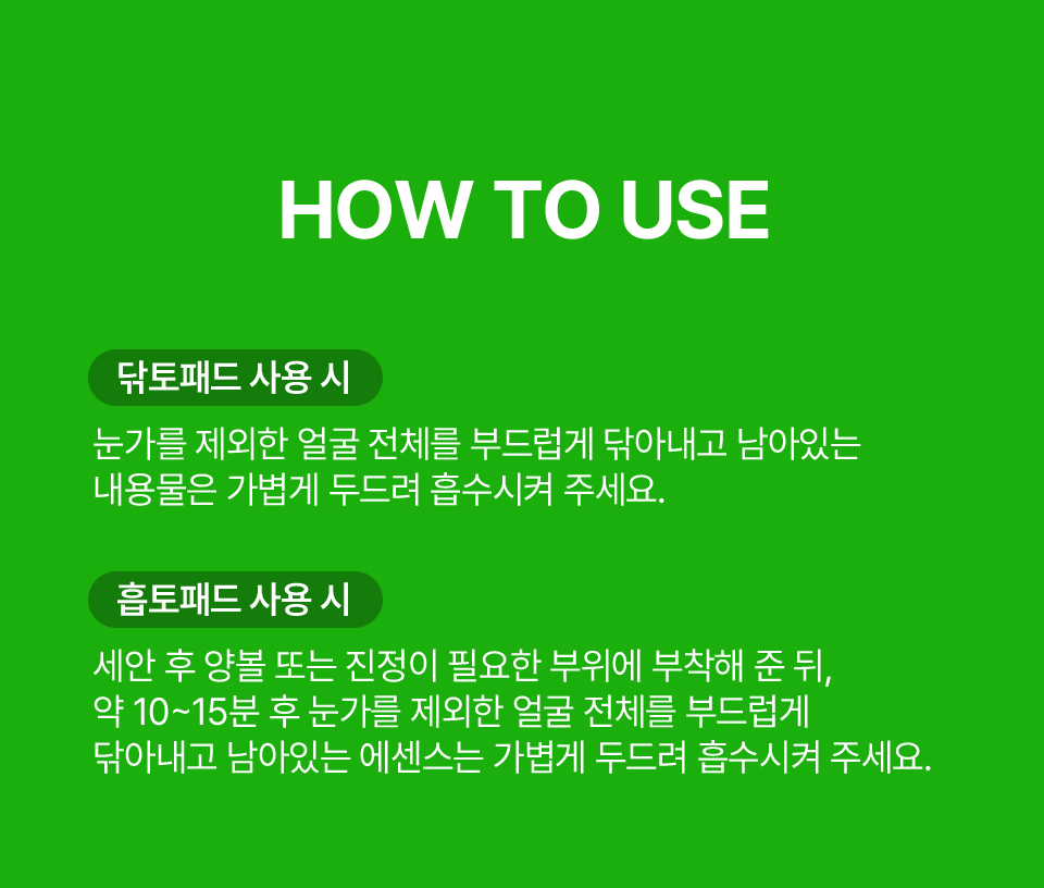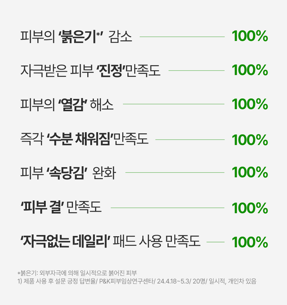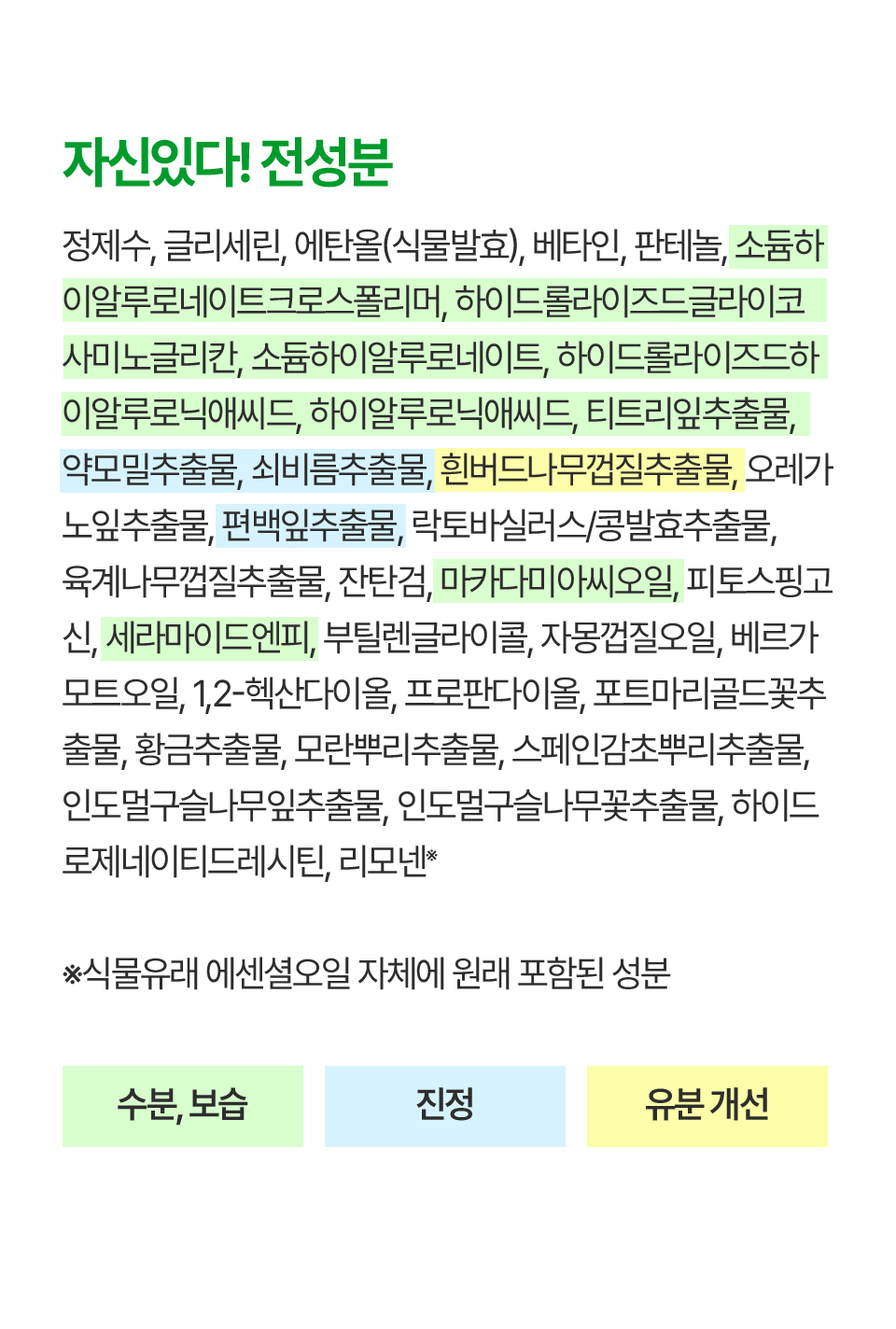 정제수, 글리세린, 에탄올(식물발효), 베타인, 판테놀, 소듐하이알루로네이트크로스폴리머, 하이드롤라이즈드하이알루로닉애씨드, 하이알루로닉애씨드, 티트리잎추출물, 약모밀추출물(어성초추출물), 쇠비름추출물, 흰버드나무껍질추출물, 오레가노잎추출물, 편백잎추출물, 락토바실러스/콩발효추출물, 육계나무껍질추출물, 잔탄검, 마카다미아씨오일, 피토스핑고신, 세라마이드엔피, 부틸렌글라이콜, 자몽껍질오일, 베르가모트오일, 1,2-헥산다이올, 프로판다이올, 포트마리골드꽃추출물, 활금추출물, 모란뿌리추출물, 스페인감초뿌리추출물, 인도멀구슬나무잎추출물, 하이드로제네이트드레시틴, 리모넨※ ※식물유래 에센셜오일 자체에 원래 포함된 성분