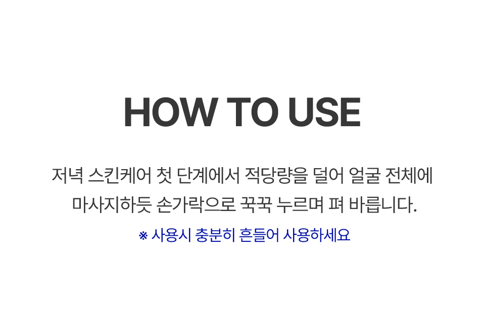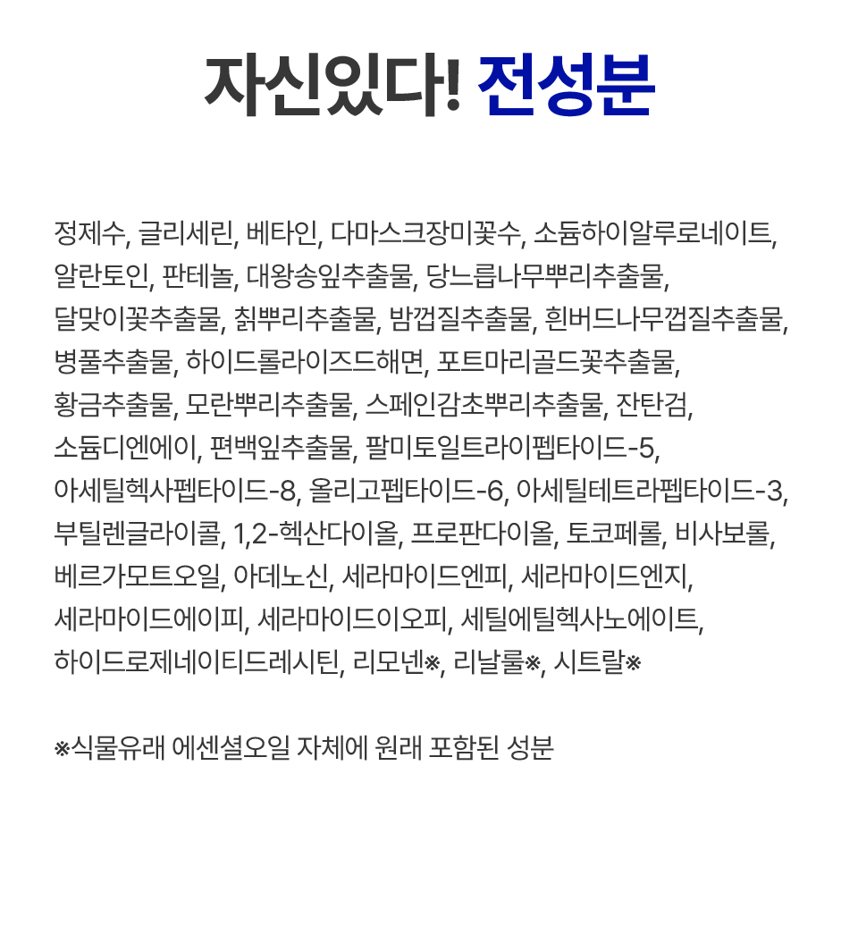 정제수, 글리세린, 베타인, 다마스크장미꽃수, 소듐하이알루로네이트, 알란토인, 판테놀, 대왕송잎추출물, 당느릅나무뿌리추출물, 달맞이꽃추출물,칡뿌리추출물, 밤껍질추출물, 흰버드나무껍질추출물, 병풀추출물, 하이드롤라이즈드해면, 포트마리골드꽃추출물, 황금추출물, 모란뿌리추출물,스페인감초뿌리추출물, 잔탄검, 소듐디엔에이, 편백잎추출물, 팔미토일트라이펩타이드-5, 아세틸헥사펩타이드-8, 올리고펩타이드-6,아세틸테트라펩타이드-3, 부틸렌글라이콜, 1,2-헥산다이올, 프로판다이올, 토코페롤, 비사보롤, 베르가모트오일, 아데노신, 세라마이드엔피,세라마이드엔지, 세라마이드에이피, 세라마이드이오피, 세틸에틸헥사노에이트, 하이드로제네이티드레시틴, 리모넨※, 리날룰※, 시트랄※ ※식물유래 에센셜오일 자체에 원래 포함된 성분