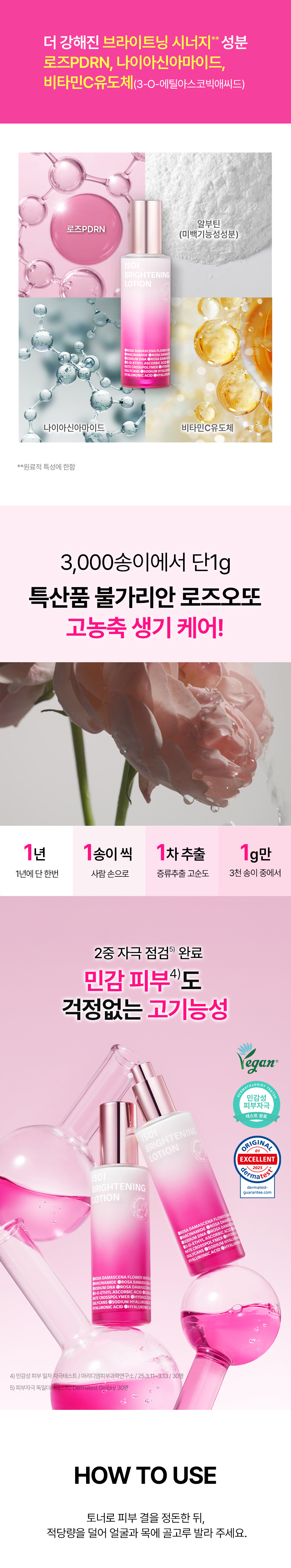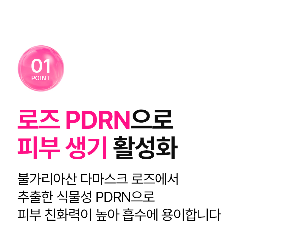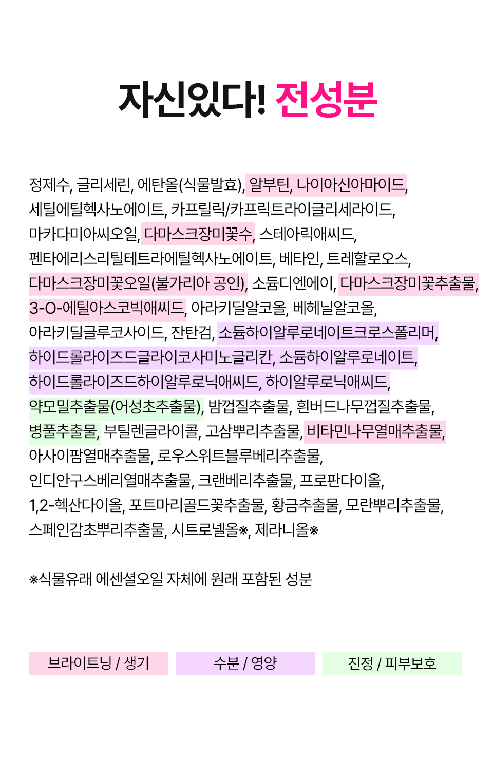 정제수, 글리세린, 에탄올(식물발효), 알부틴, 나이아신아마이드, 세틸에틸헥사노에이트, 카프릴릭/카프릭트라이글리세라이드, 마카다미아씨오일, 다마스크장미꽃수, 스테아릭애씨드, 펜타에리스리틸테트라에틸헥사노에이트, 베타인, 트레할로오스, 다마스크장미꽃오일(불가리아 공인), 소듐디엔에이, 다마스크장미꽃추출물, 3-O-에틸아스코빅애씨드, 아라키딜알코올, 베헤닐알코올, 아라키딜글루코사이드, 잔탄검, 소듐하이알루로네이트크로스폴리머, 하이드롤라이즈드글라이코사미노글리칸, 소듐하이알루로네이트, 하이드롤라이즈드하이알루로닉애씨드, 하이알루로닉애씨드, 약모밀추출물(어성초추출물), 밤껍질추출물, 흰버드나무껍질추출물, 병풀추출물, 부틸렌글라이콜, 고삼뿌리추출물, 비타민나무열매추출물, 아사이팜열매추출물, 로우스위트블루베리추출물, 인디안구스베리열매추출물, 크랜베리추출물, 프로판다이올, 1,2-헥산다이올, 포트마리골드꽃추출물, 황금추출물, 모란뿌리추출물, 스페인감초뿌리추출물, 시트로넬올※, 제라니올※ ※식물유래 에센셜오일 자체에 원래 포함된 성분