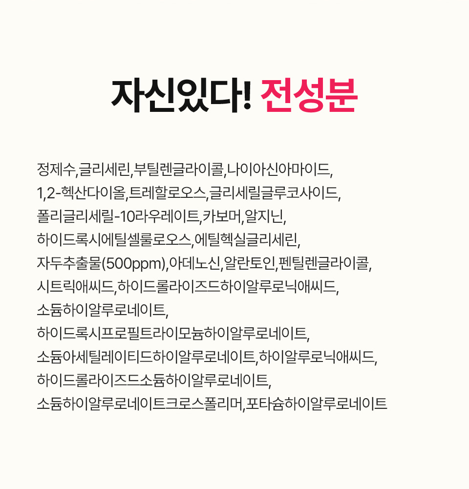 정제수,글리세린,부틸렌글라이콜,나이아신아마이드(20,000ppm),1,2-헥산다이올,트레할로오스,글리세릴글루코사이드,폴리글리세릴-10라우레이트,카보머,알지닌,하이드록시에틸셀룰로오스,에틸헥실글리세린,자두추출물(500ppm),아데노신,알란토인,펜틸렌글라이콜,시트릭애씨드,하이드롤라이즈드하이알루로닉애씨드,소듐하이알루로네이트,하이드록시프로필트라이모늄하이알루로네이트,소듐아세틸레이티드하이알루로네이트,하이알루로닉애씨드,하이드롤라이즈드소듐하이알루로네이트,소듐하이알루로네이트크로스폴리머,포타슘하이알루로네이트