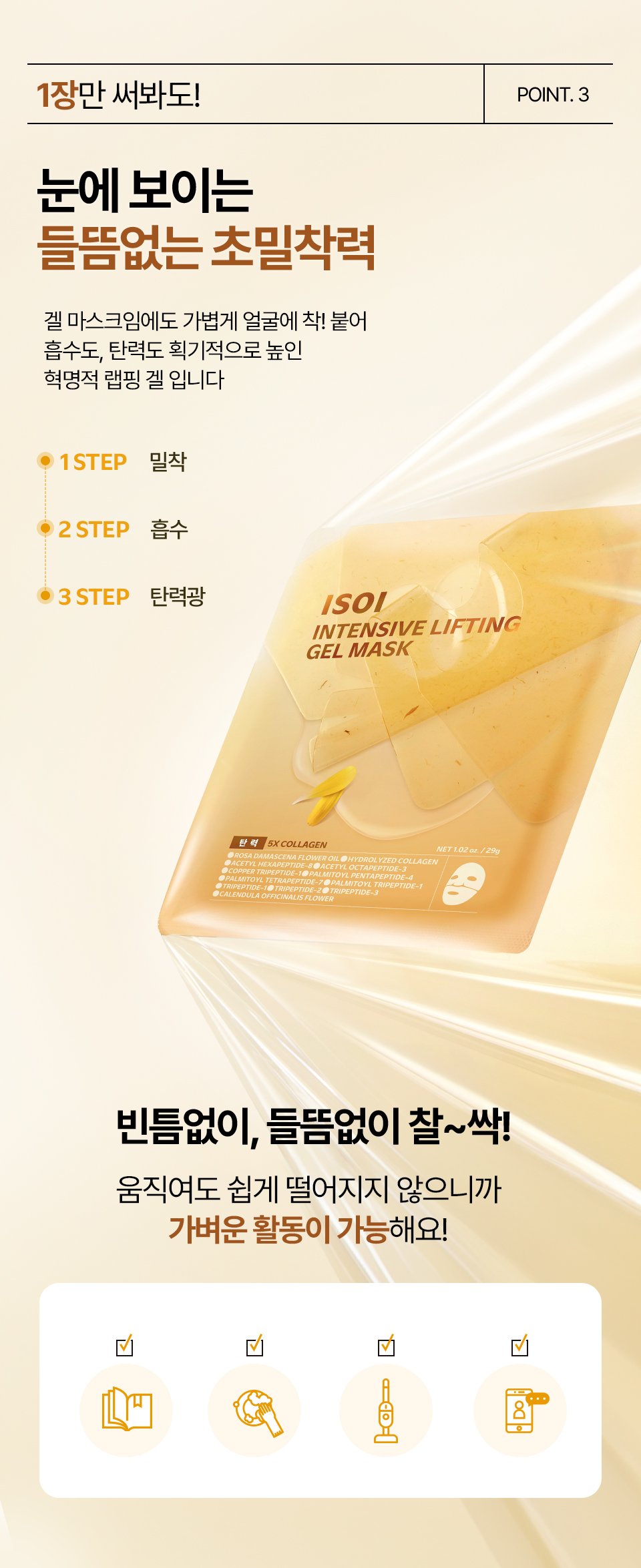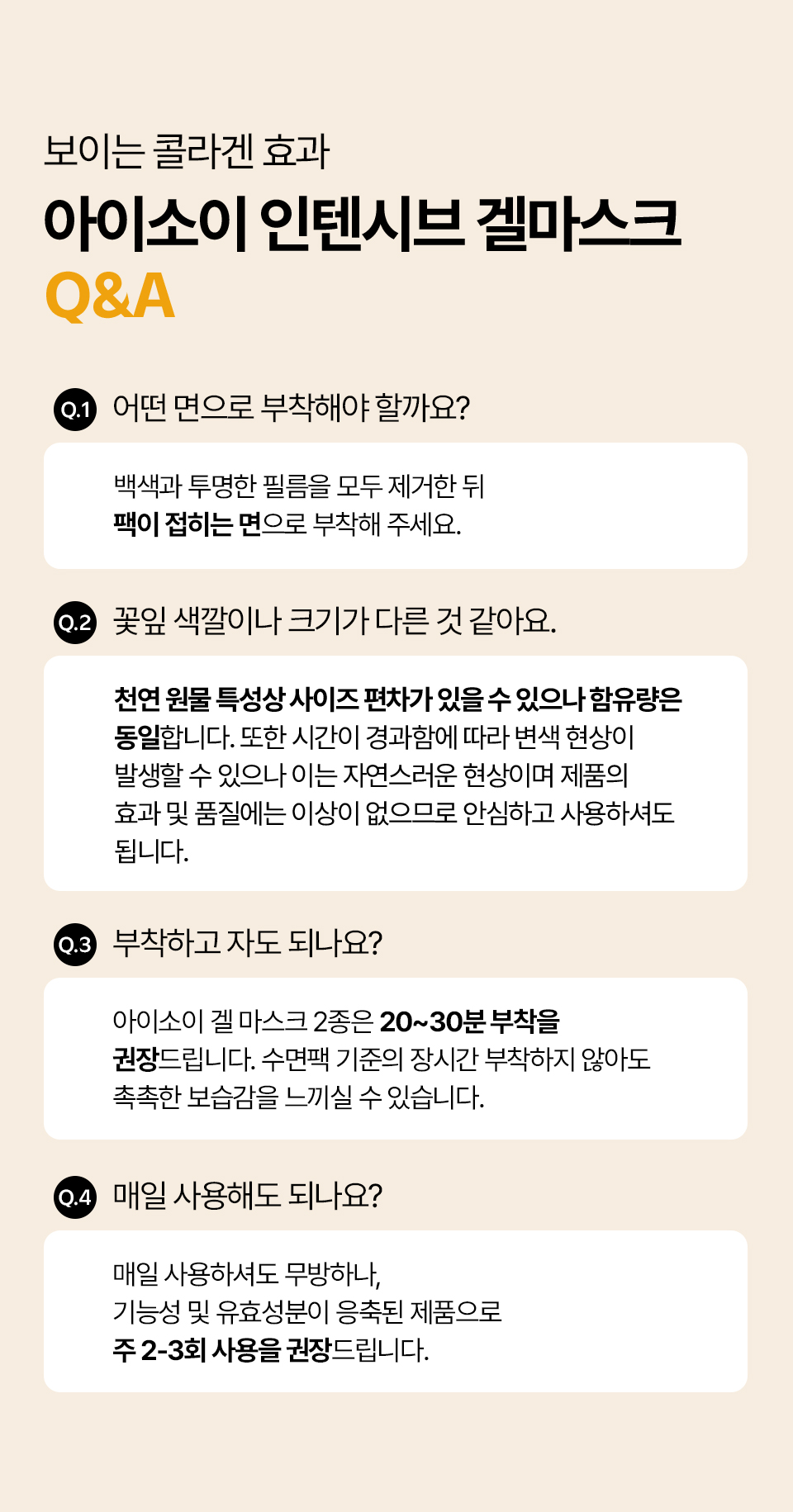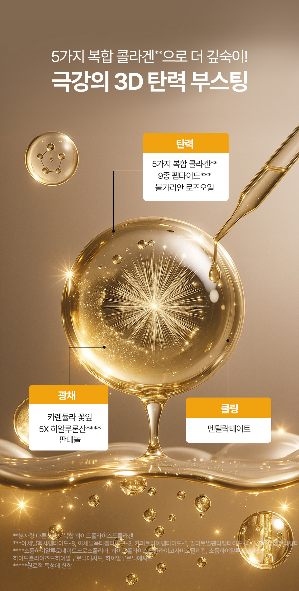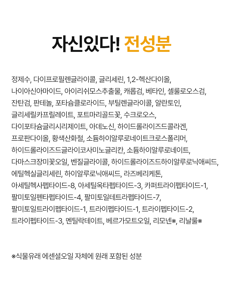 정제수, 다이프로필렌글라이콜, 글리세린, 1,2-헥산다이올, 나이아신아마이드, 아이리쉬모스추출물, 캐롭검, 베타인, 셀룰로오스검, 잔탄검, 판테놀, 포타슘클로라이드, 부틸렌글라이콜, 알란토인, 글리세릴카프릴레이트, 포트마리골드꽃, 수크로오스,다이포타슘글리시리제이트, 아데노신, 하이드롤라이즈드콜라겐, 프로판다이올, 황색산화철, 소듐하이알루로네이트크로스폴리머, 하이드롤라이즈드글라이코사미노글리칸, 소듐하이알루로네이트, 다마스크장미꽃오일, 벤질글라이콜, 하이드롤라이즈드하이알루로닉애씨드, 에틸헥실글리세린, 하이알루로닉애씨드, 라즈베리케톤, 아세틸헥사펩타이드-8, 아세틸옥타펩타이드-3, 카퍼트라이펩타이드-1, 팔미토일펜타펩타이드-4, 팔미토일테트라펩타이드-7, 팔미토일트라이펩타이드-1, 트라이펩타이드-1, 트라이펩타이드-2, 트라이펩타이드-3, 멘틸락테이트, 베르가모트오일, 리모넨※, 리날룰※ ※식물유래 에센셜 오일 자체에 원래 포함된 성분