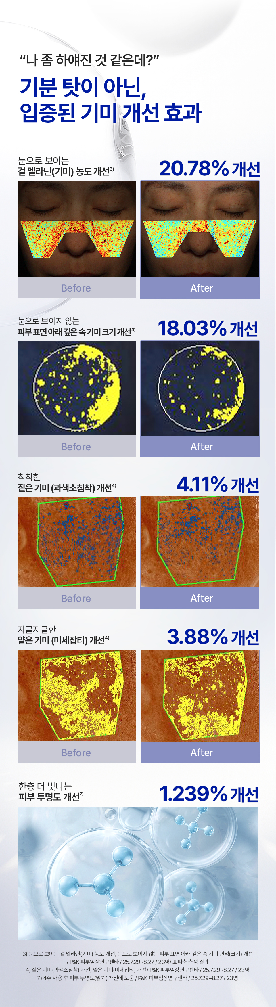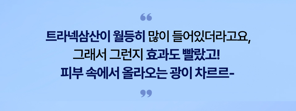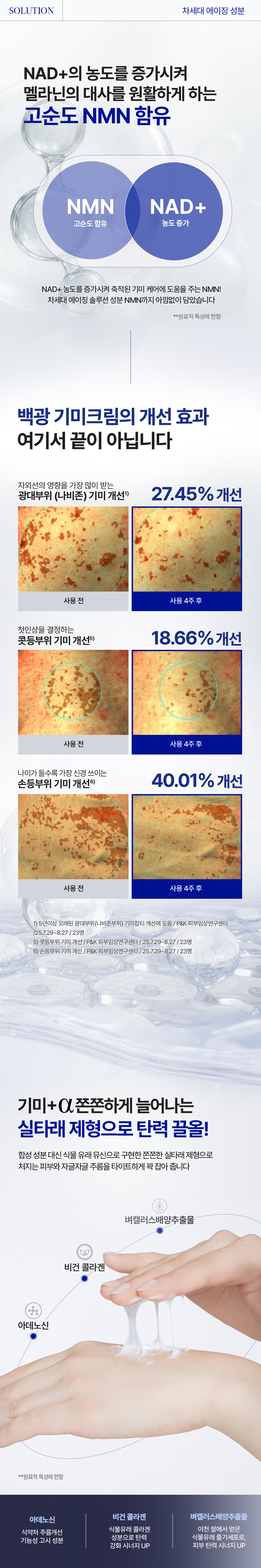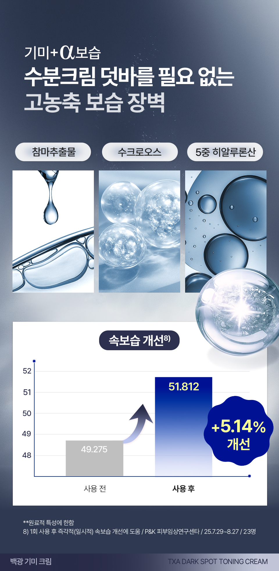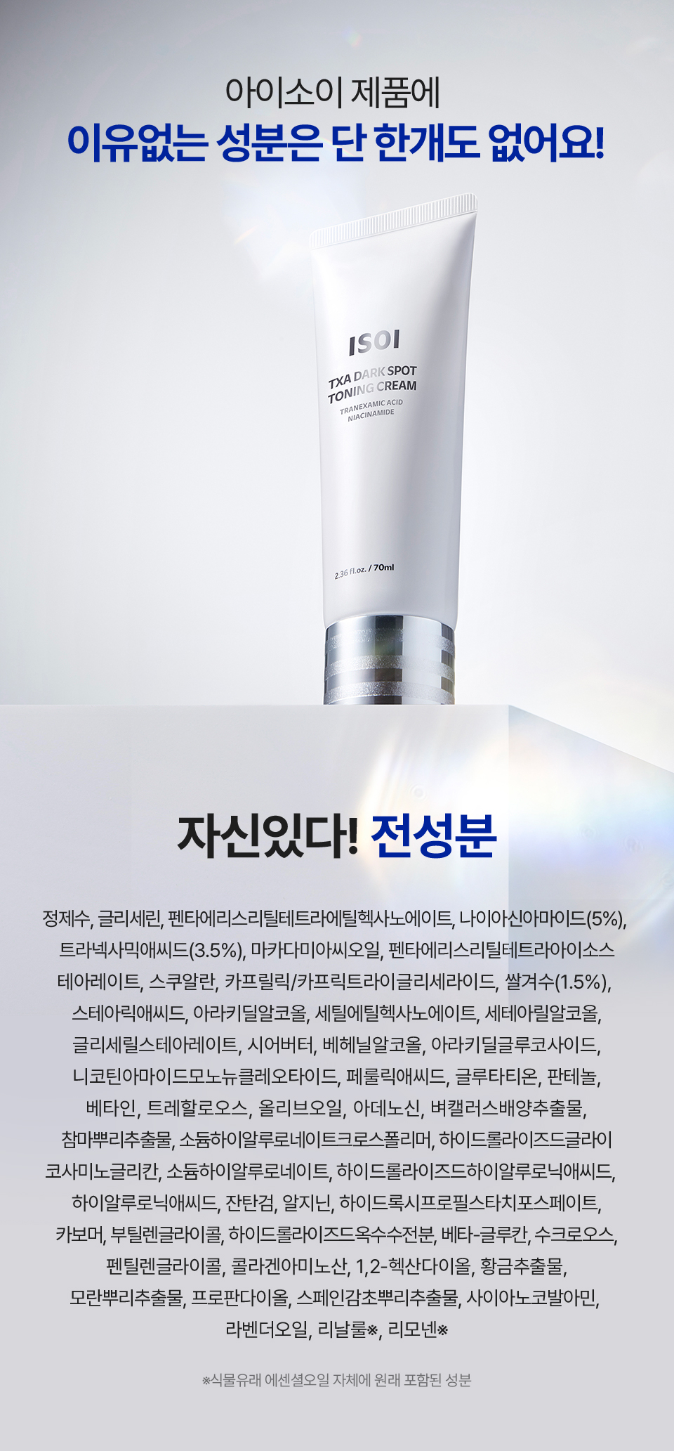 정제수, 글리세린, 펜타에리스리틸테트라에틸헥사노에이트, 나이아신아마이드(5%), 트라넥사믹애씨드(3.5%), 마카다미아씨오일, 펜타에리스리틸테트라아이소스테아레이트, 스쿠알란, 카프릴릭/카프릭트라이글리세라이드, 쌀겨수(1.5%), 스테아릭애씨드, 아라키딜알코올, 세틸에틸헥사노에이트, 세테아릴알코올, 글리세릴스테아레이트, 시어버터, 베헤닐알코올, 아라키딜글루코사이드, 니코틴아마이드모노뉴클레오타이드, 페룰릭애씨드, 글루타티온, 판테놀, 베타인, 트레할로오스, 올리브오일, 아데노신, 벼캘러스배양추출물, 참마뿌리추출물, 소듐하이알루로네이트크로스폴리머, 하이드롤라이즈드글라이코사미노글리칸, 소듐하이알루로네이트, 하이드롤라이즈드하이알루로닉애씨드, 하이알루로닉애씨드, 잔탄검, 알지닌, 하이드록시프로필스타치포스페이트, 카보머, 부틸렌글라이콜, 하이드롤라이즈드옥수수전분, 베타-글루칸, 수크로오스, 펜틸렌글라이콜, 콜라겐아미노산, 1,2-헥산다이올, 황금추출물, 모란뿌리추출물, 프로판다이올, 스페인감초뿌리추출물, 사이아노코발아민, 라벤더오일, 리날룰, 리모넨