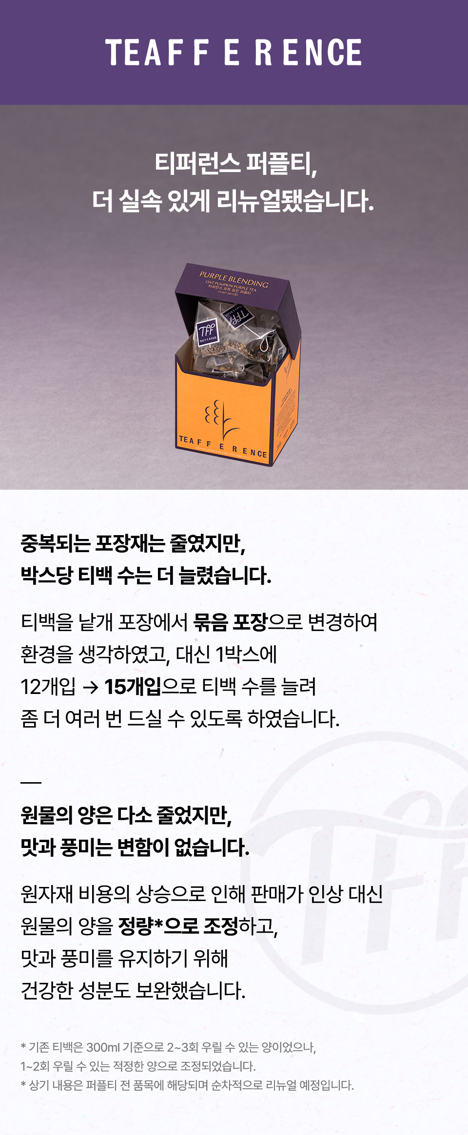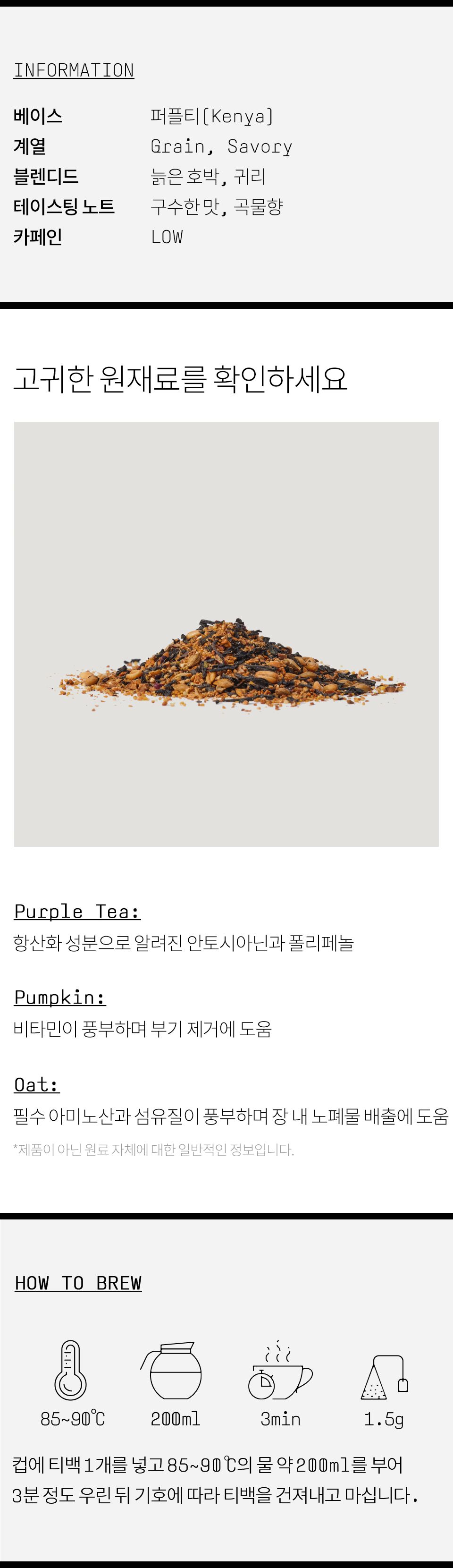 메밀(중국산), 현미(국내산), 퍼플티(홍차/케냐산), 단호박(국내산), 발아보리(국내산), 귀리(캐나다산), 팥(국내산), 늙은호박(국내산) [메밀 함유]