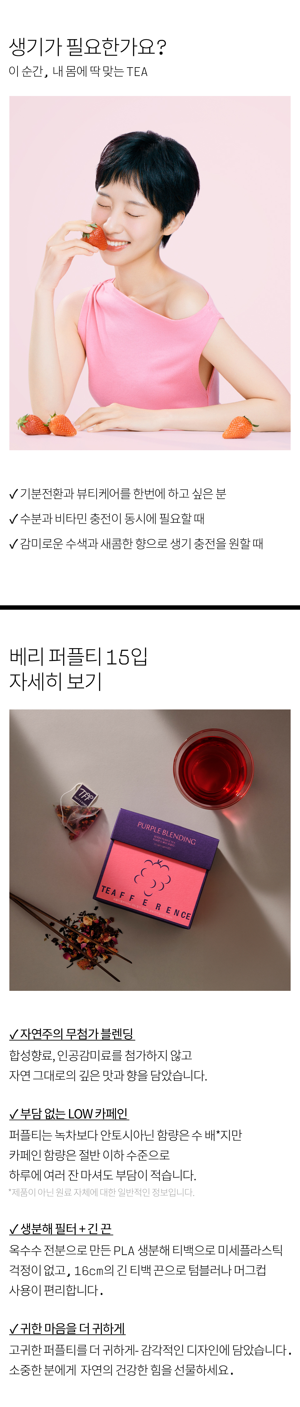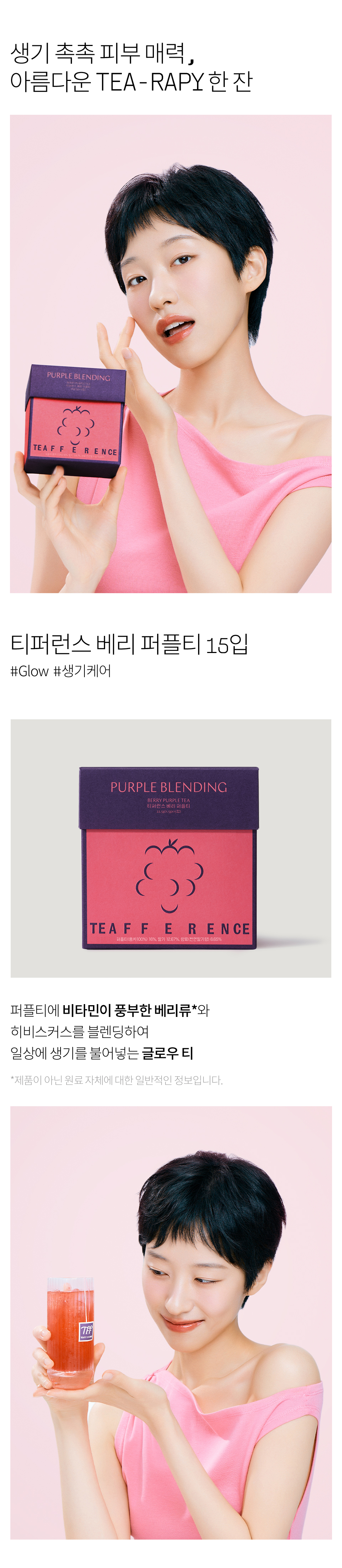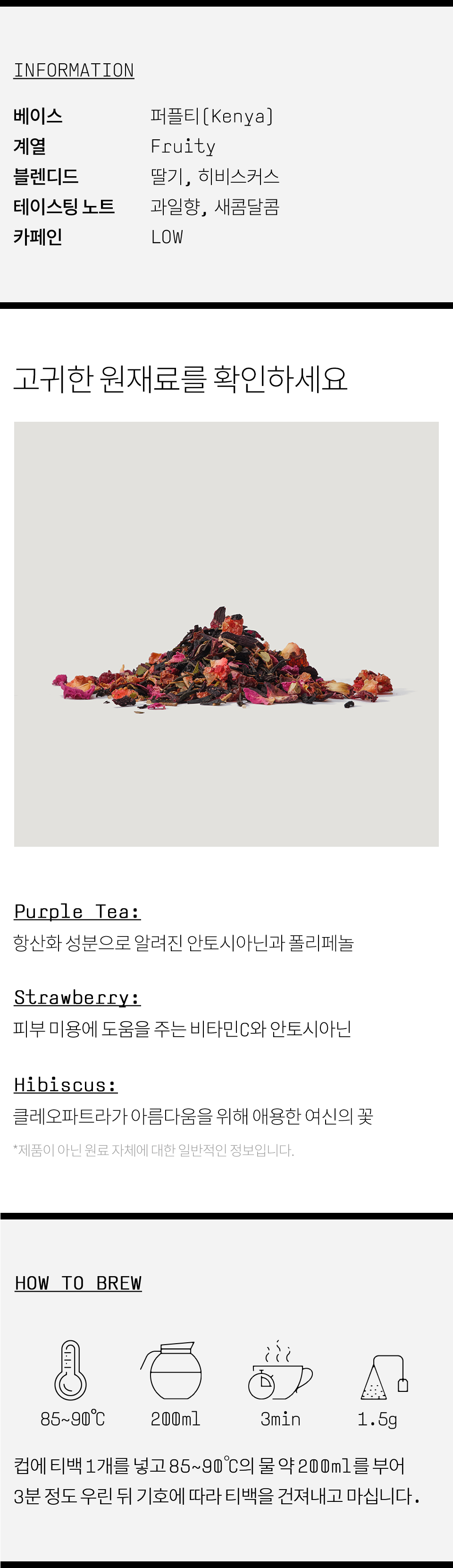 히비스커스(나이지리아산), 퍼플티(홍차/케냐산), 로즈힙(칠레산), 체리(폴란드산), 딸기(국내산), 레몬머틀, 향료(천연딸기향), 로즈플라워, 스테비아잎