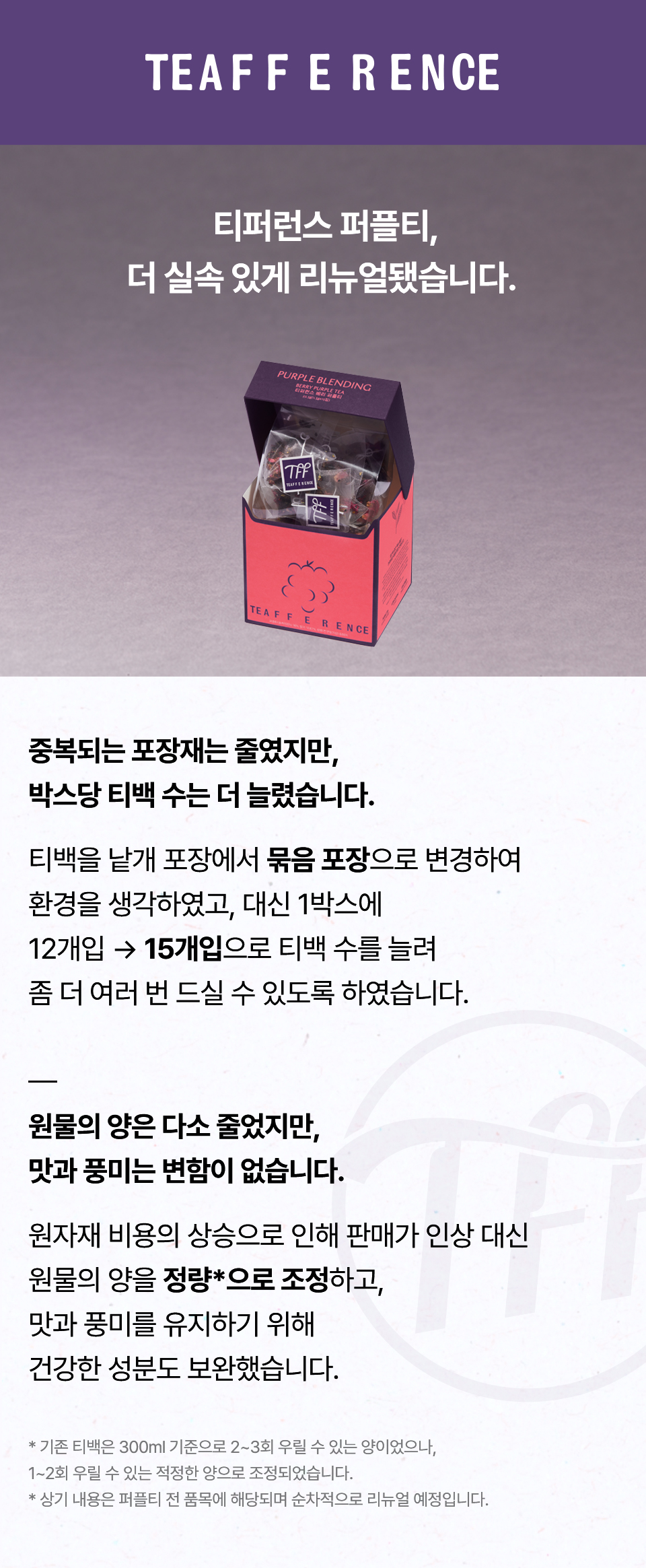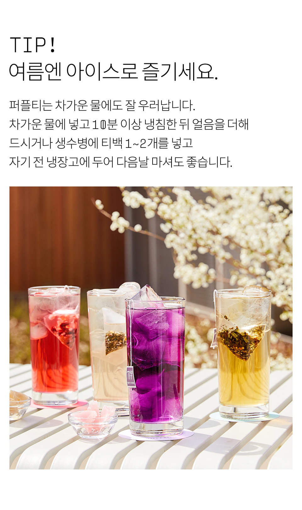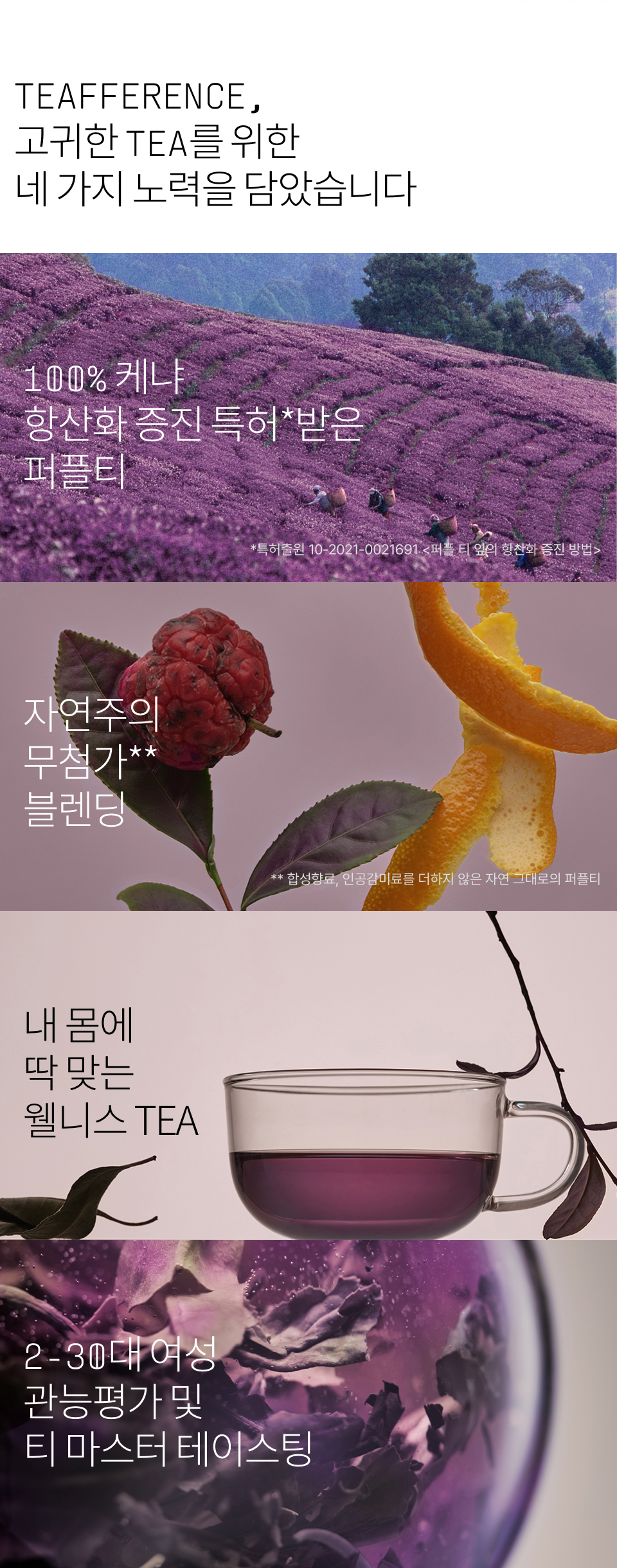 히비스커스(나이지리아산), 퍼플티(홍차/케냐산), 로즈힙(칠레산), 체리(폴란드산), 딸기(국내산), 레몬머틀, 향료(천연딸기향), 로즈플라워, 스테비아잎