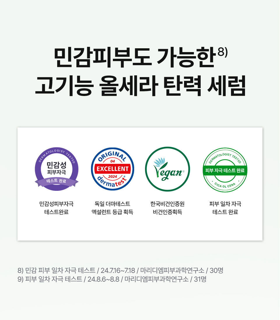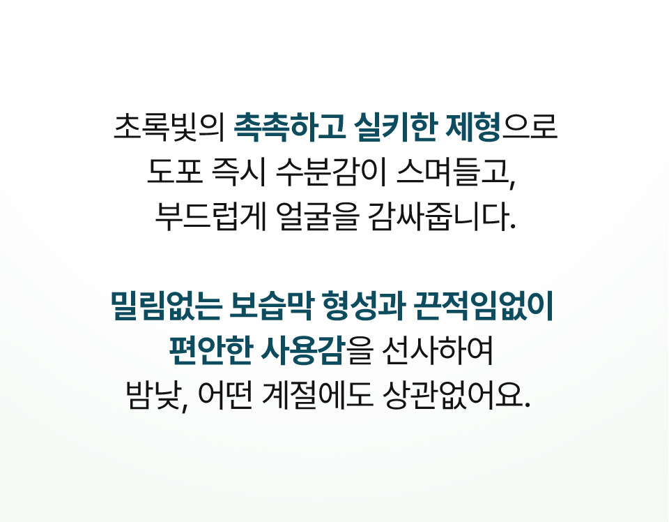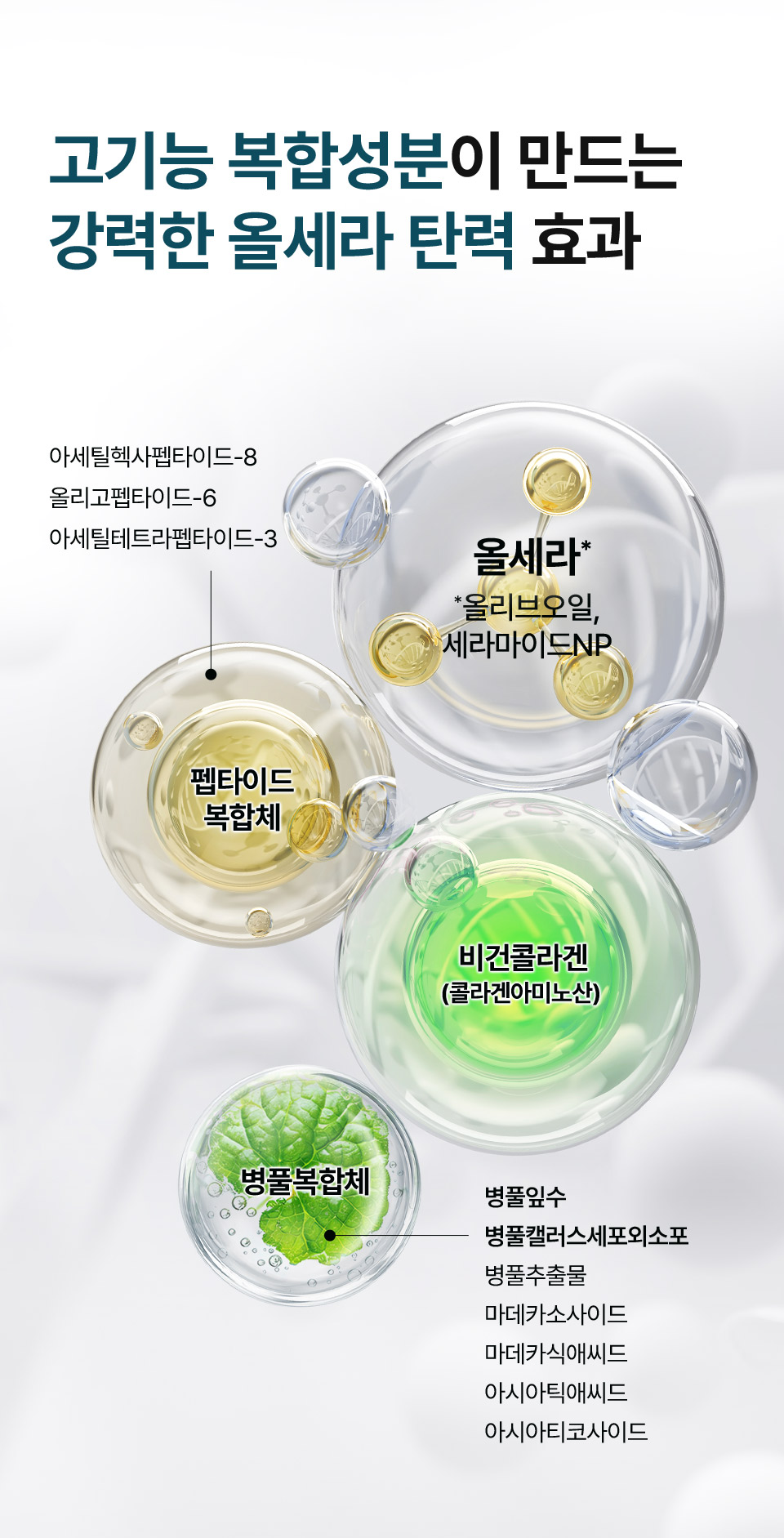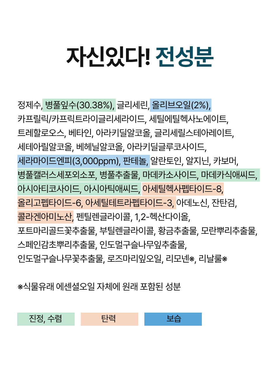 정제수, 병풀잎수(30.38%), 글리세린, 올리브오일(2%), 카프릴릭/카프릭트라이글리세라이드, 세틸에틸헥사노에이트, 트레할로오스, 베타인, 아라키딜알코올, 글리세릴스테아레이트, 세테아릴알코올, 베헤닐알코올, 아라키딜글루코사이드, 세라마이드엔피(3,000ppm), 판테놀, 알란토인, 알지닌, 카보머, 병풀캘러스세포외소포, 병풀추출물, 마데카소사이드, 마데카식애씨드, 아시아티코사이드, 아시아틱애씨드, 아세틸헥사펩타이드-8, 올리고펩타이드-6, 아세틸테트라펩타이드-3, 아데노신, 잔탄검, 콜라겐아미노산, 펜틸렌글라이콜, 1,2-헥산다이올, 포트마리골드꽃추출물, 부틸렌글라이콜, 황금추출물, 모란뿌리추출물, 스페인감초뿌리추출물, 인도멀구슬나무잎추출물, 인도멀구슬나무꽃추출물, 로즈마리잎오일, 리모넨※, 리날룰※ ※식물유래 에센셜오일 자체에 원래 포함된 성분